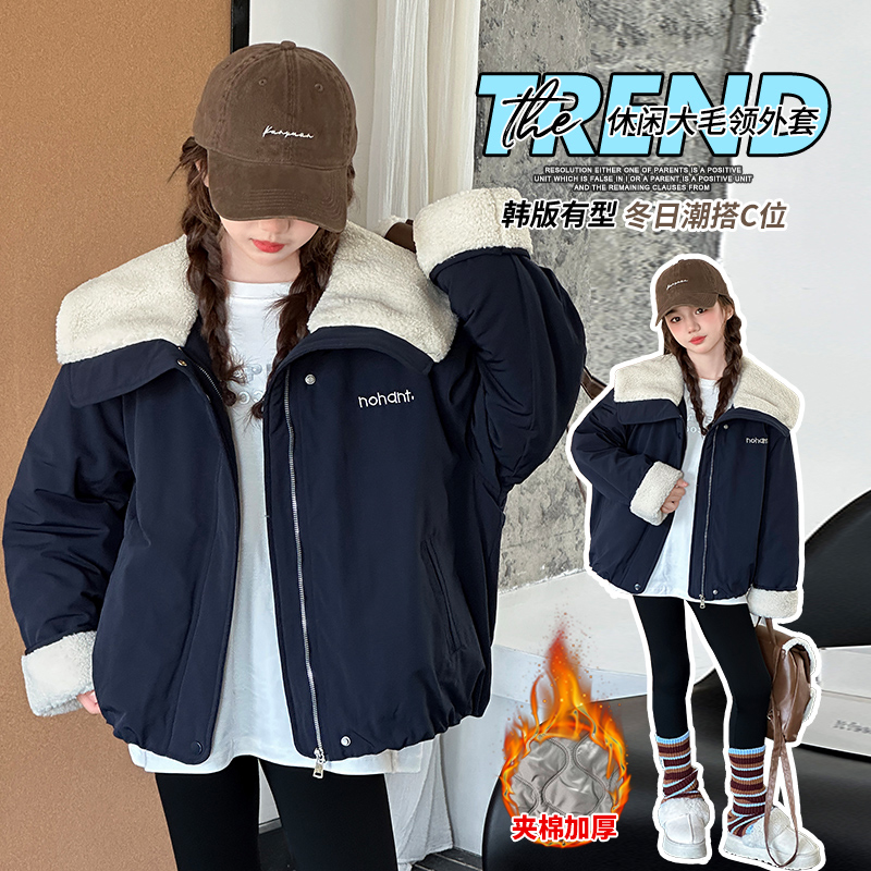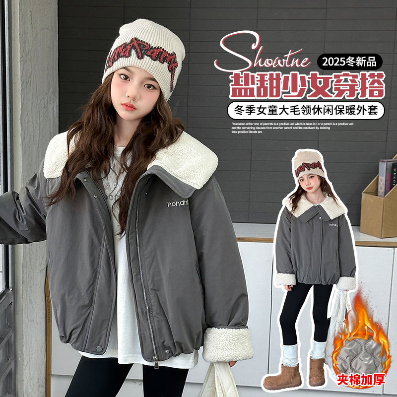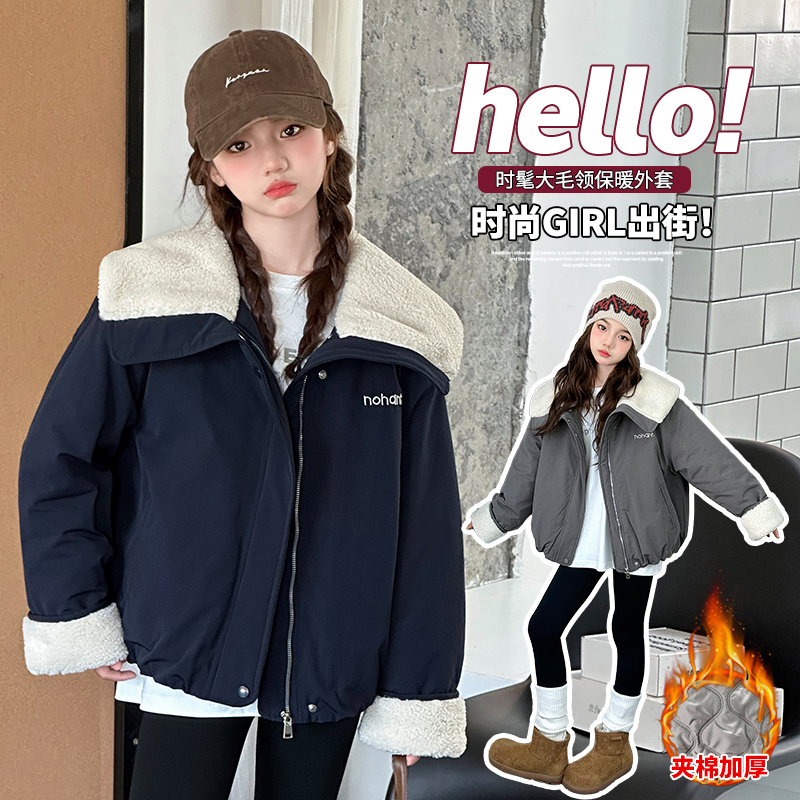 女童棉服2025新款秋冬洋气时髦中大童韩版羊羔毛拼接加厚棉衣外套