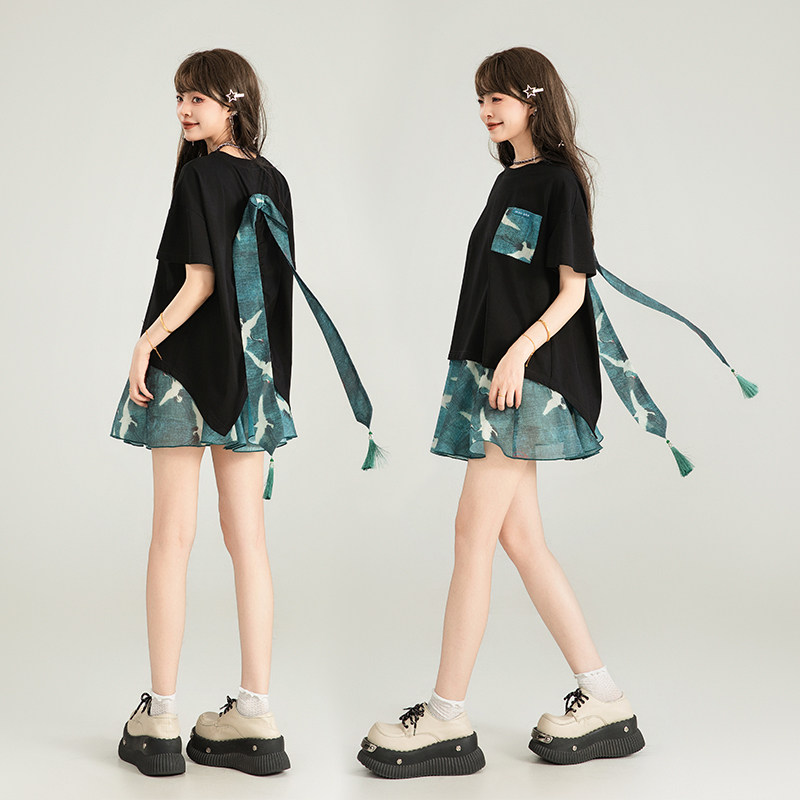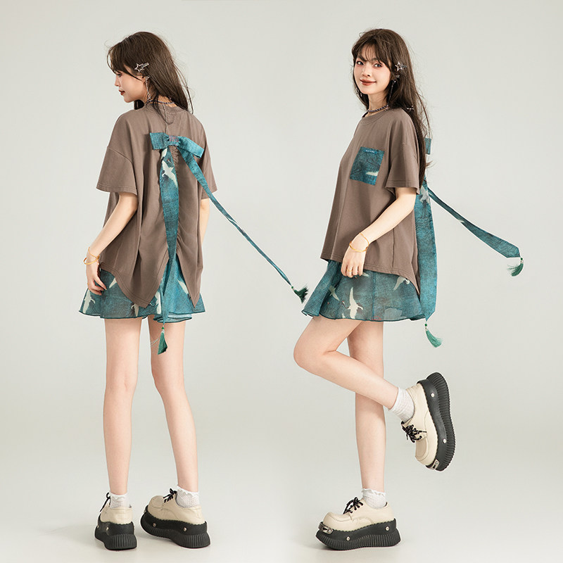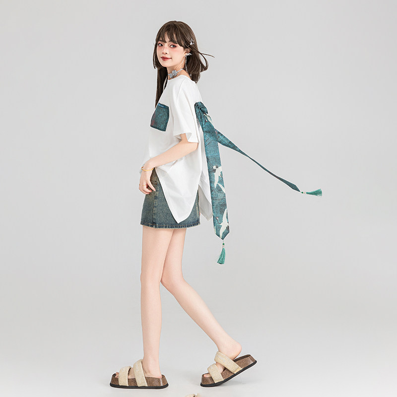 KEIKO 新中式蝴蝶结飘带饰白色t恤女夏季小众别致宽松短袖上衣