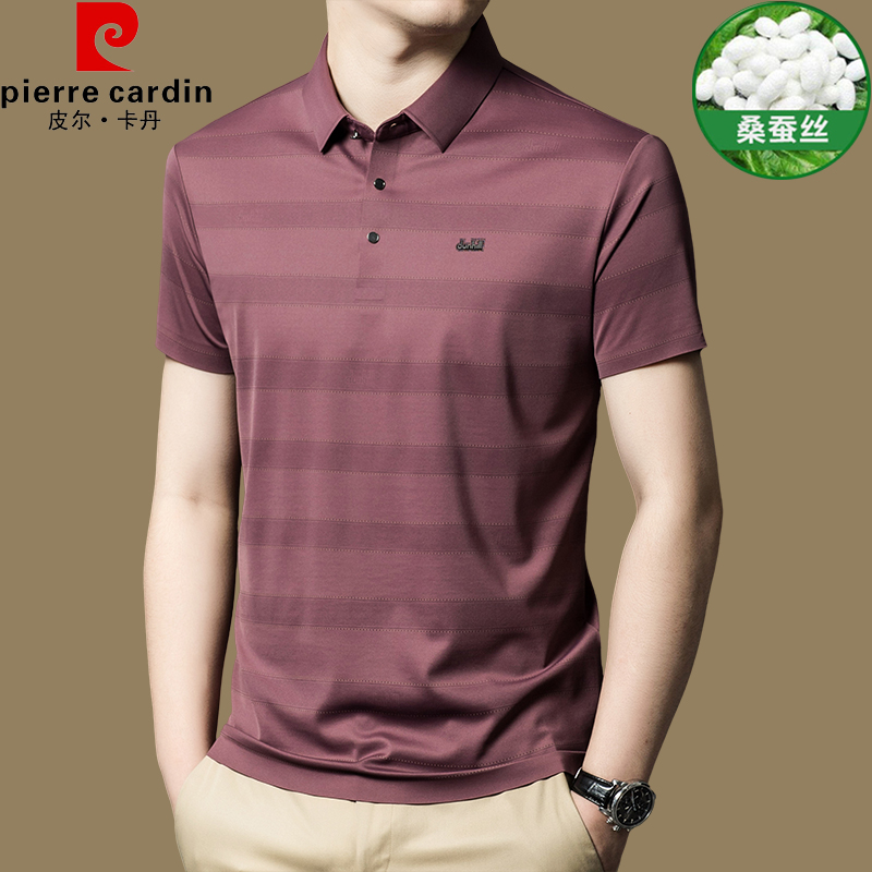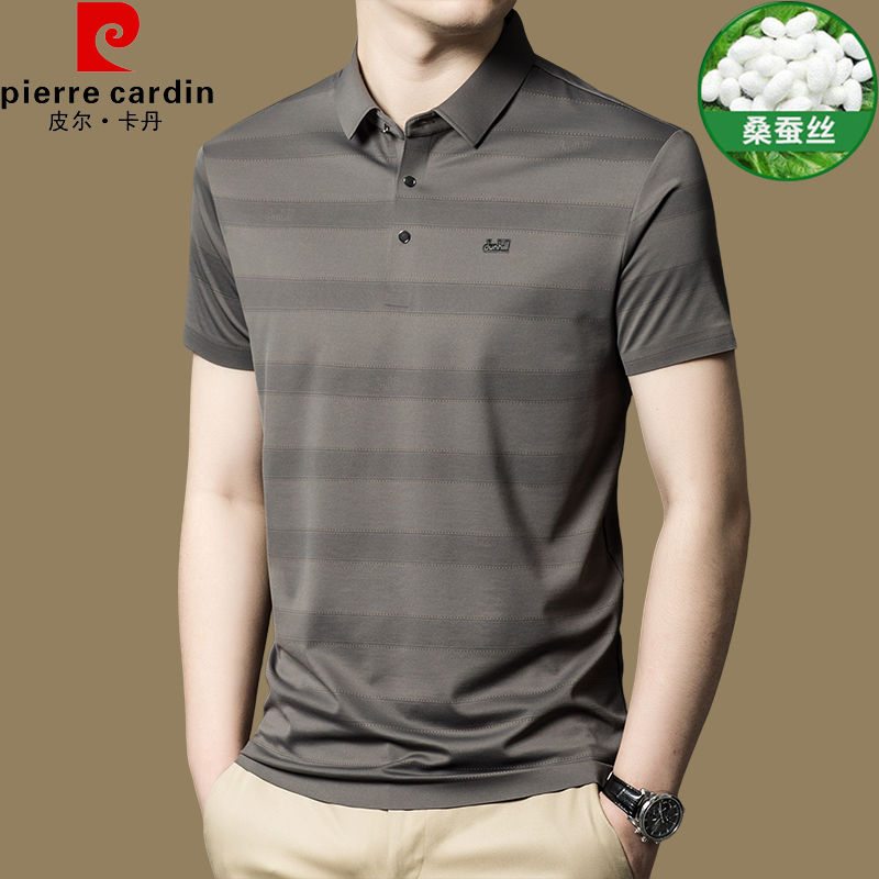 皮尔卡丹高端品牌中年条纹翻领桑蚕丝男士短袖t恤2025新款冰丝
