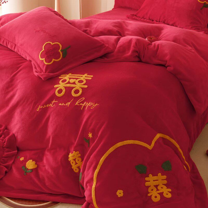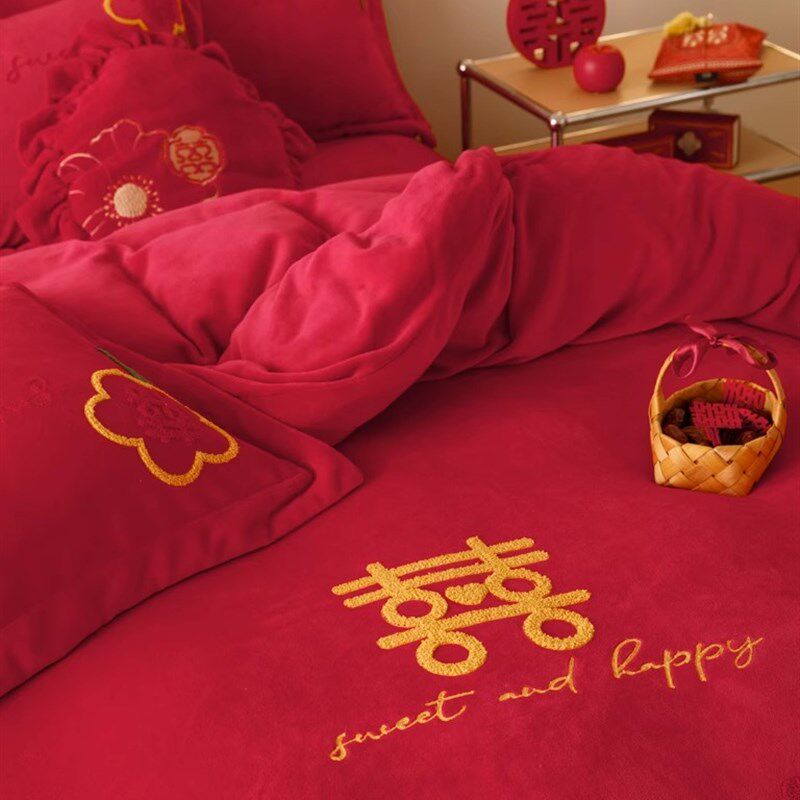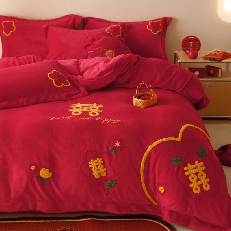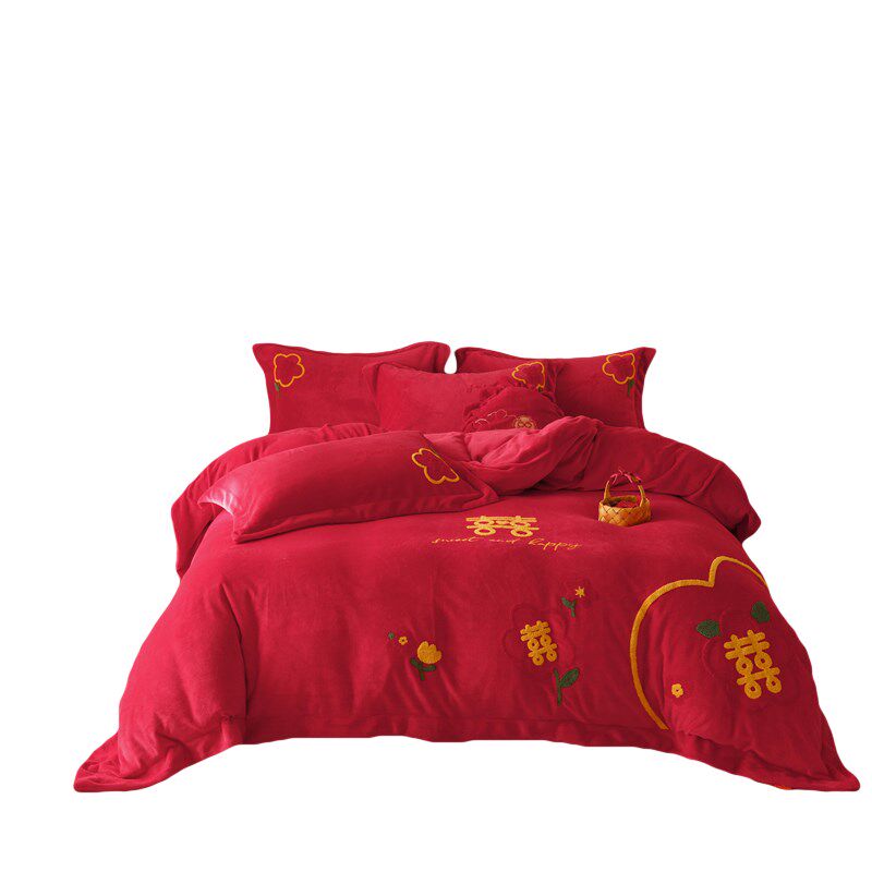 高端牛奶绒结婚四件套冬季加厚喜被大红色被套床单新X婚庆加绒床