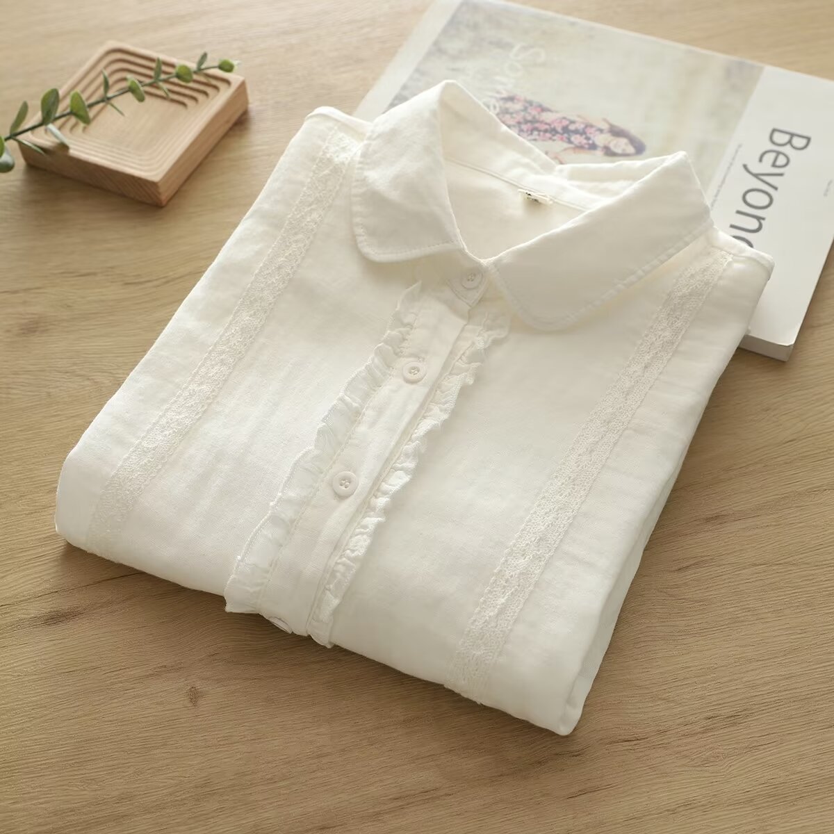 长袖双层棉纱木耳边衬衫女