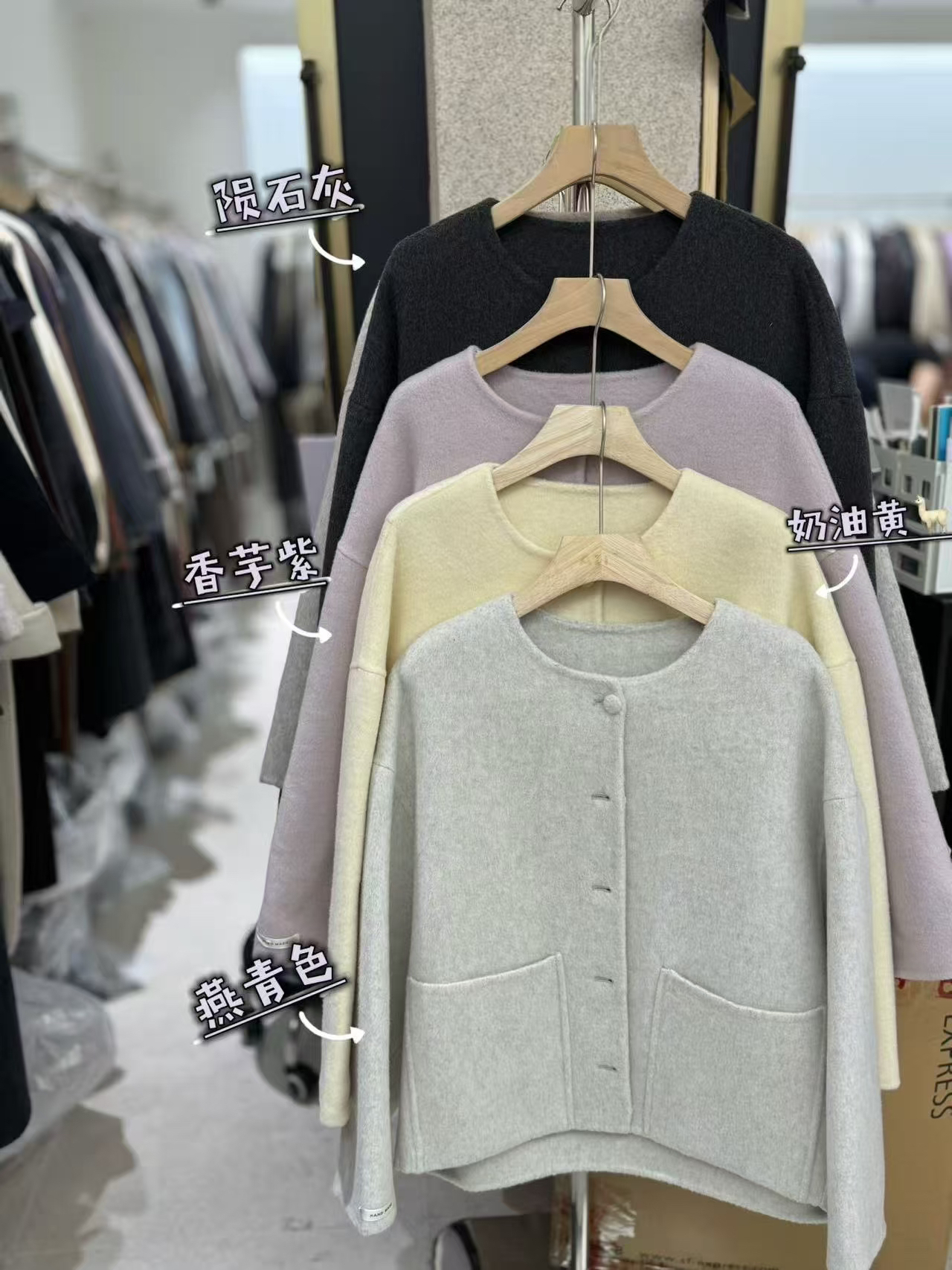 2025年冬季新款韩版女装纯色圆领双面羊毛毛呢外套单排扣开衫大衣