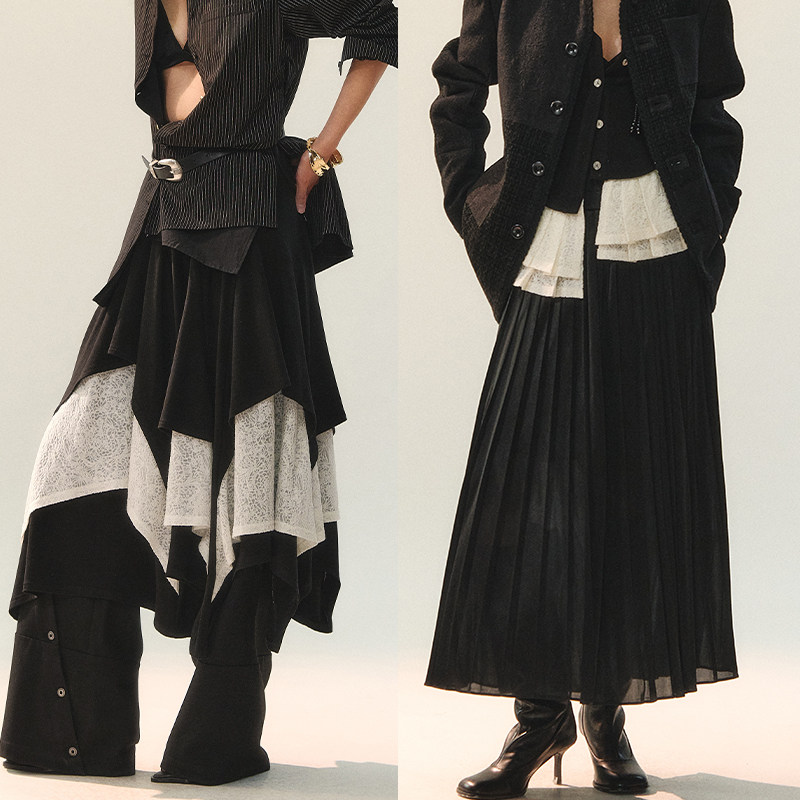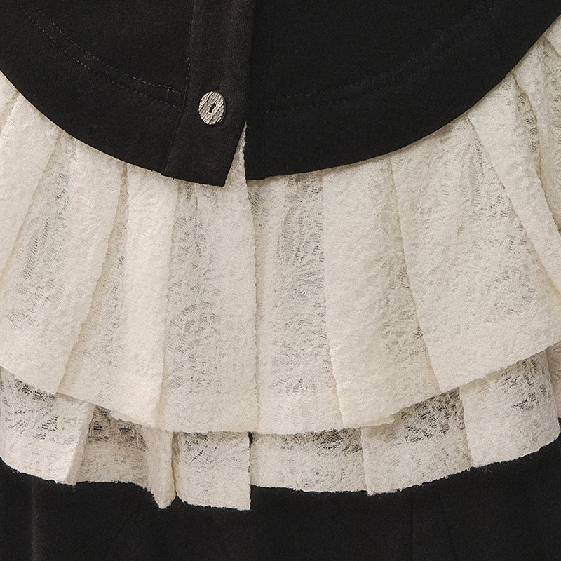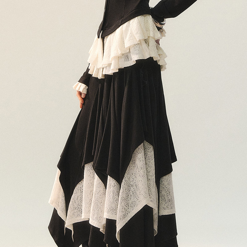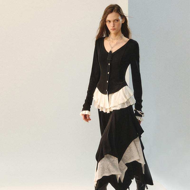 创世纪元【黑韵边章】套装女装冬羊毛蕾丝拼接V领上衣+花边半裙