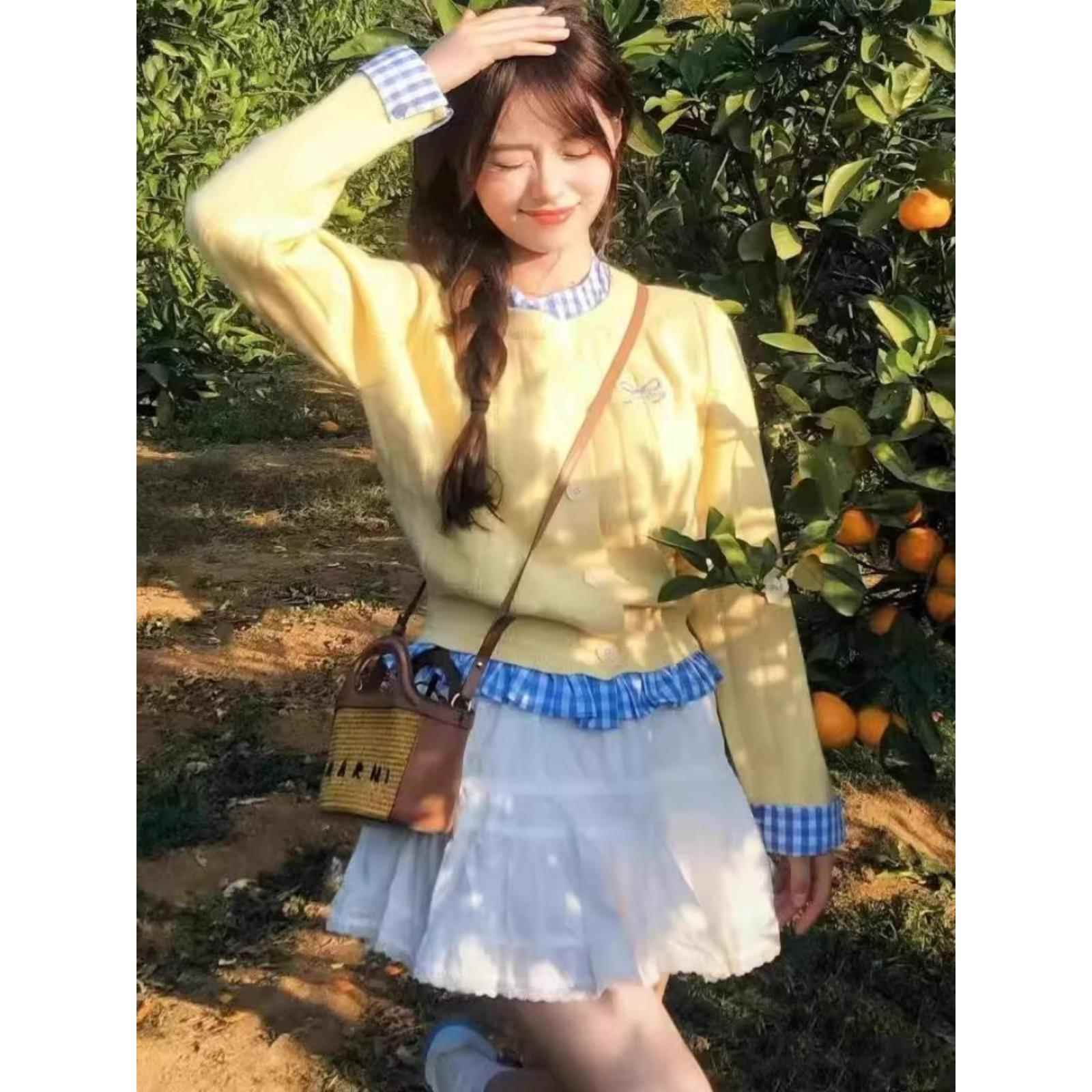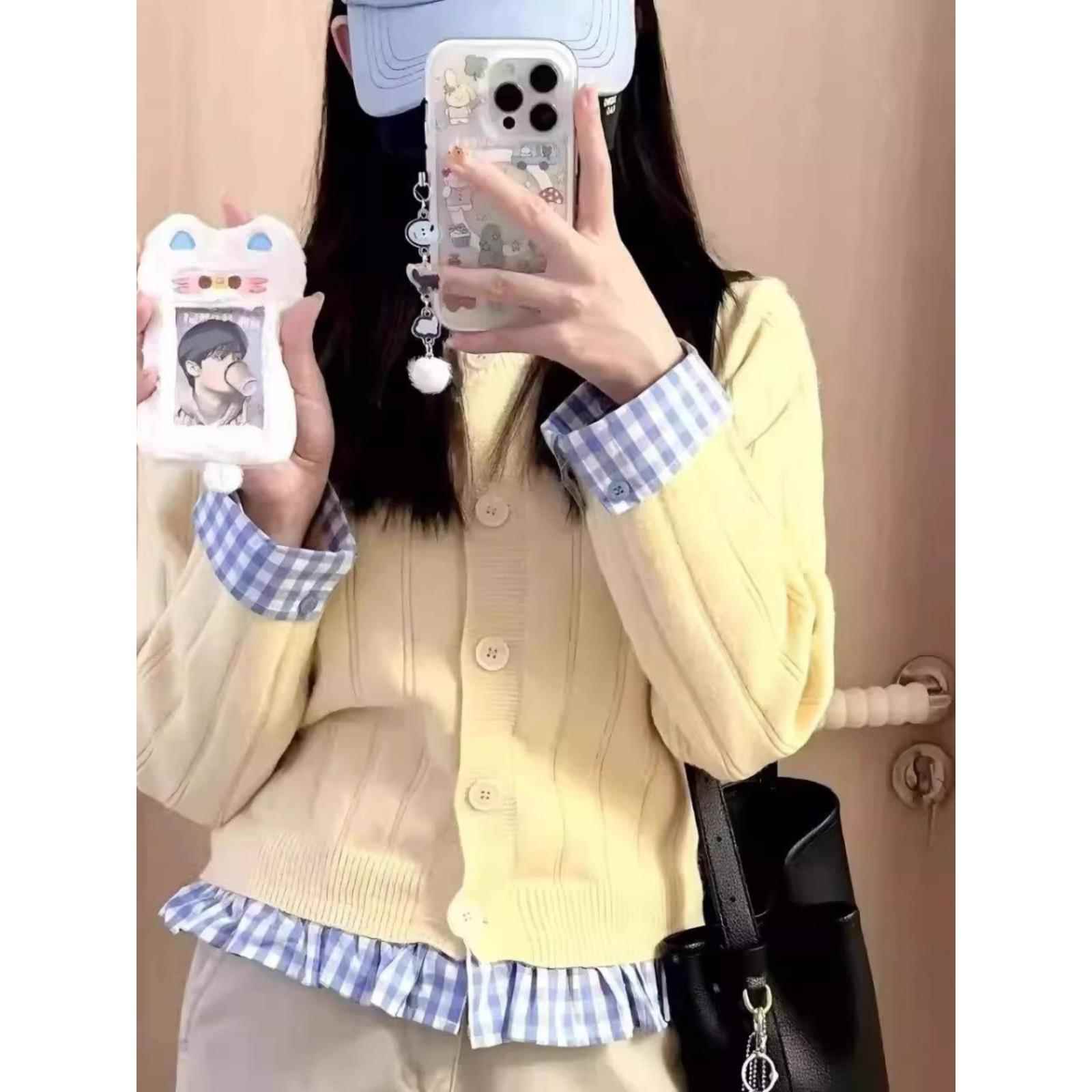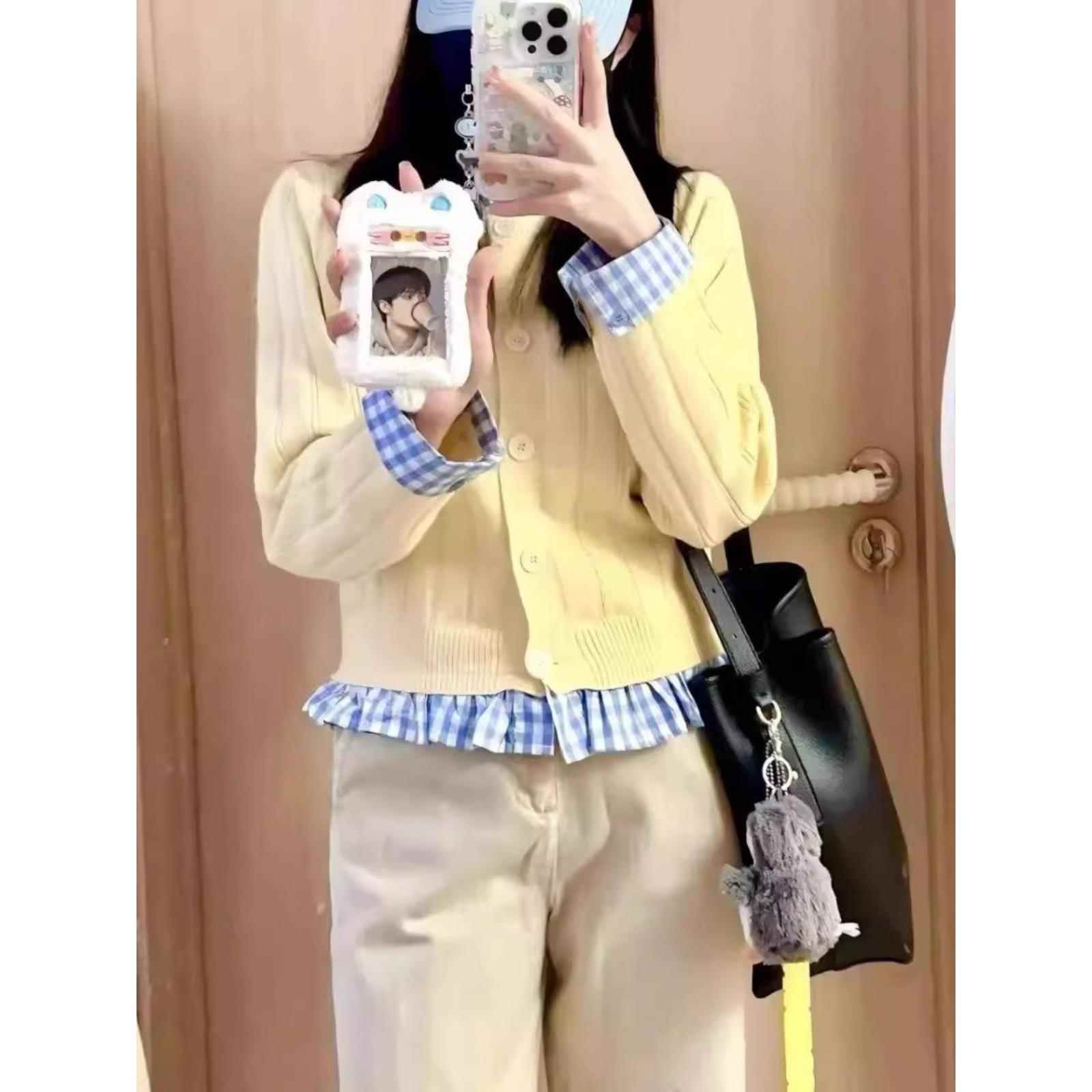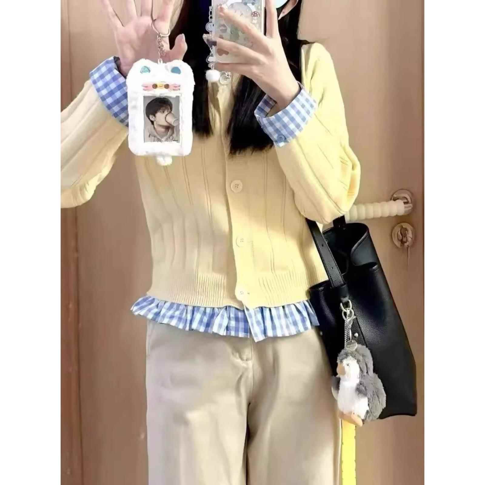 小众设计对比格纹针织开衫女子春季假两件套蝴蝶结刺绣宽松毛衣夹
