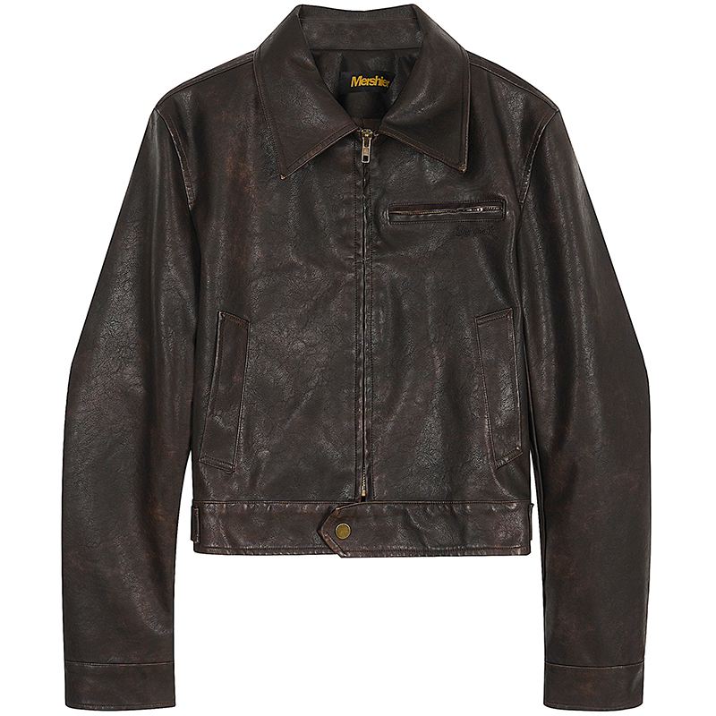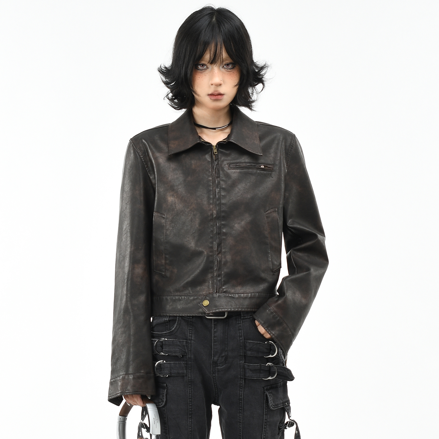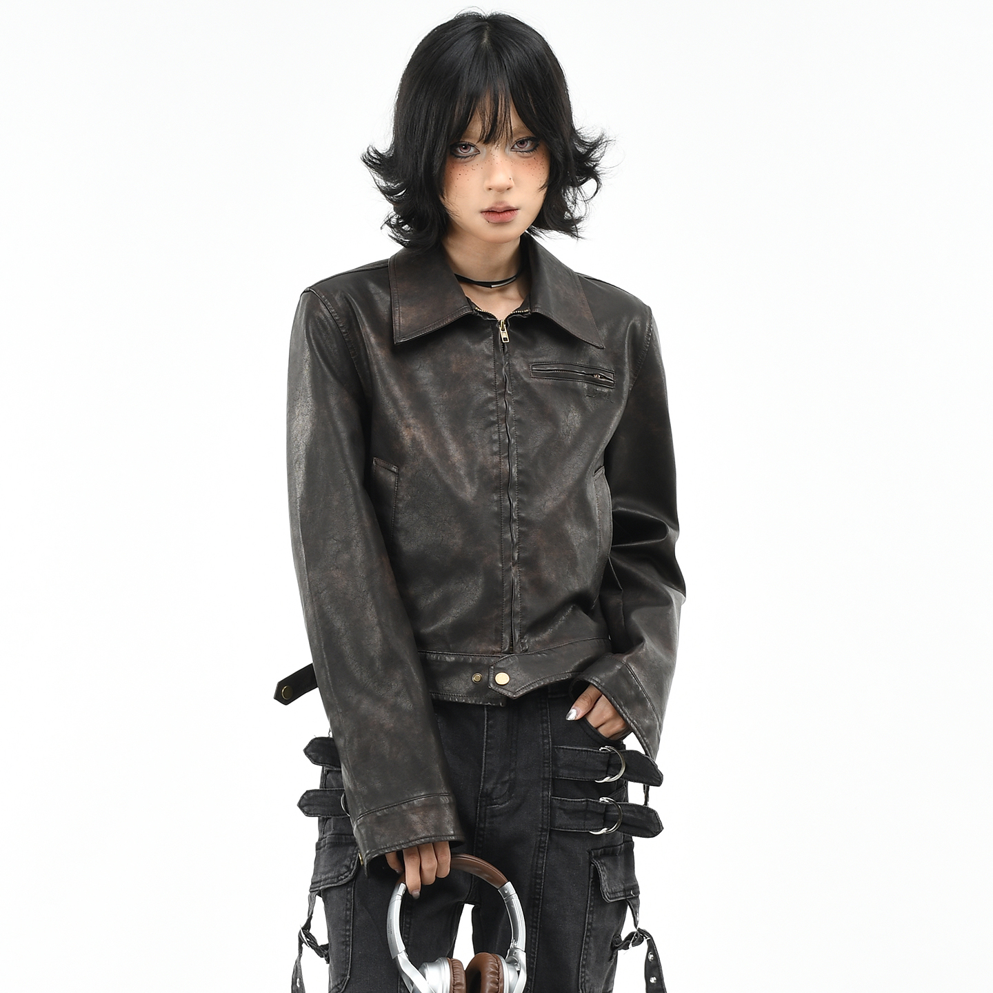 OV原创美式复古做旧皮衣外套女秋季街头机车风PU短款翻领夹克上衣