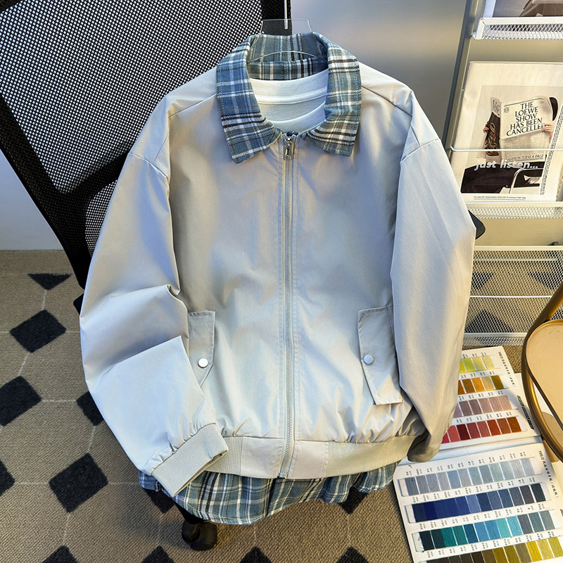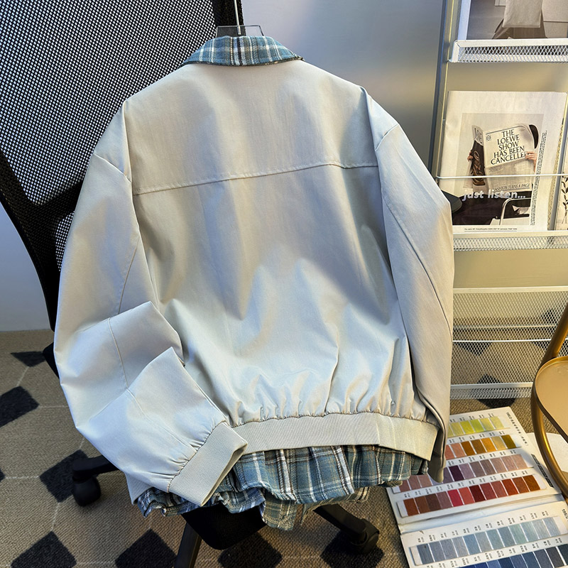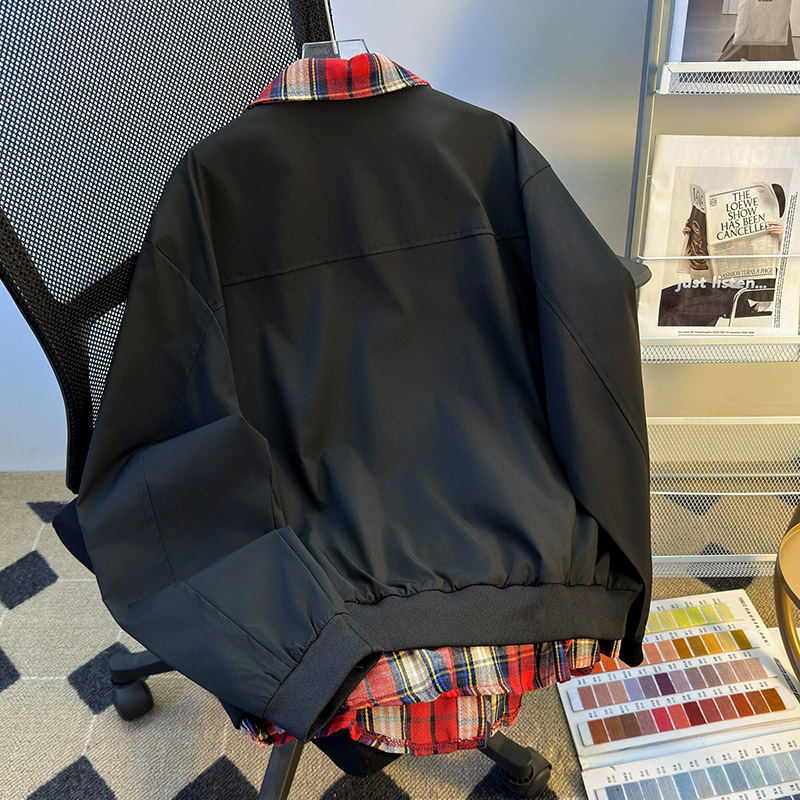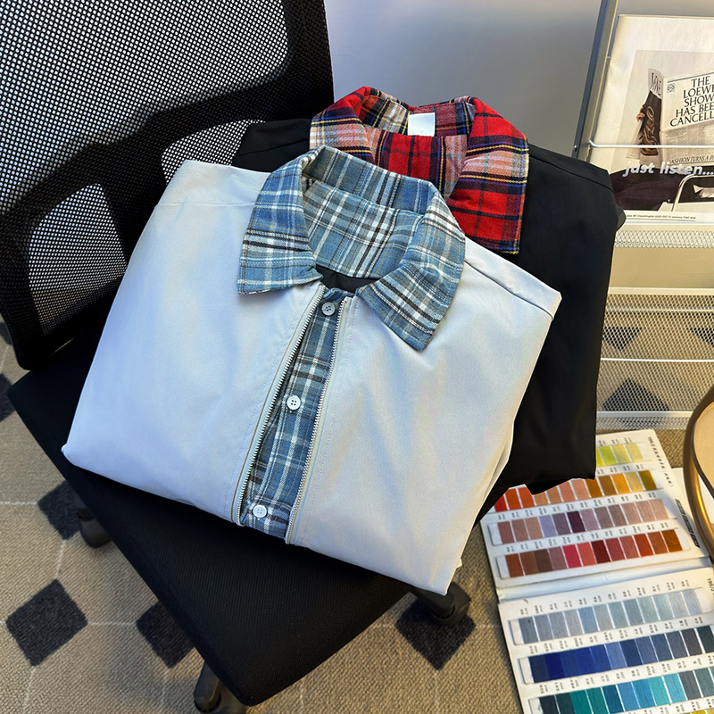 美式假两件拼接格子衬衫领夹克男装复古宽松潮牌翻领休闲工装外套
