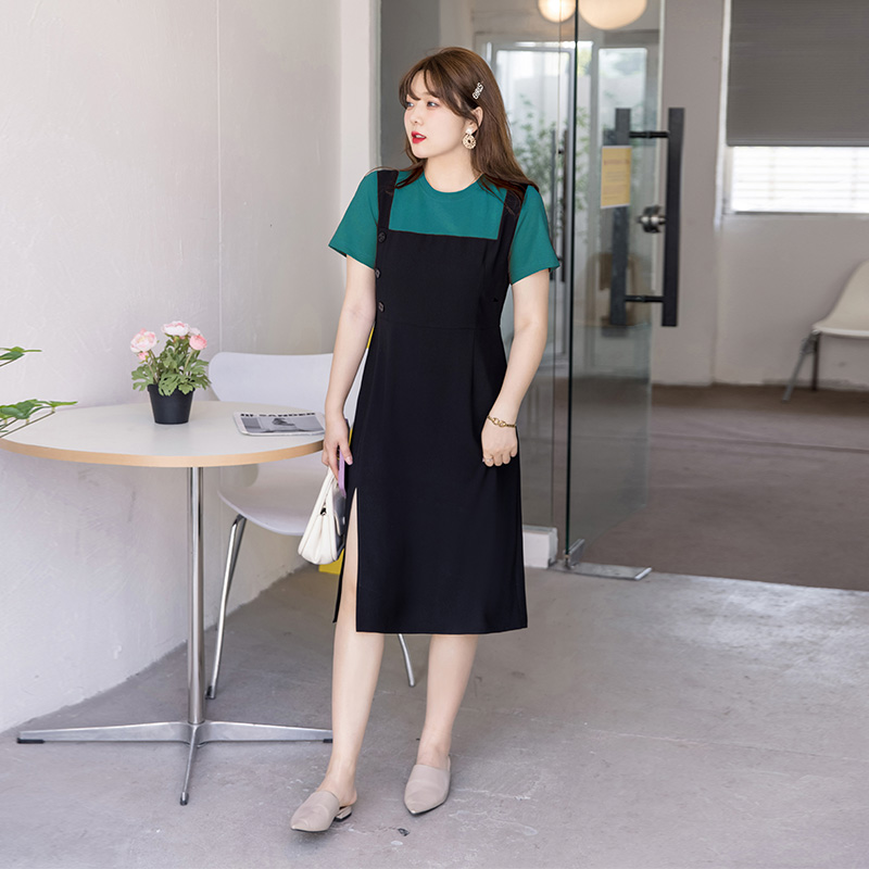 绮娑假两件背带中长款开叉胖妹妹大码女装垂坠感连衣裙显瘦遮肚子