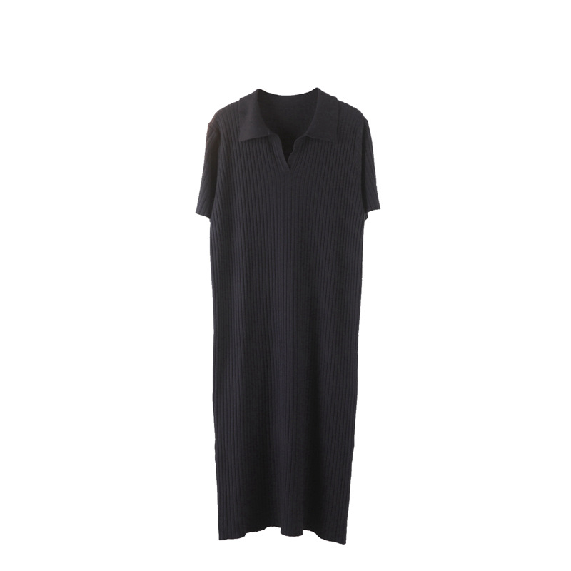 春秋季新款翻领过膝针织连衣裙女宽松打底气质短袖中长款毛衣裙子
