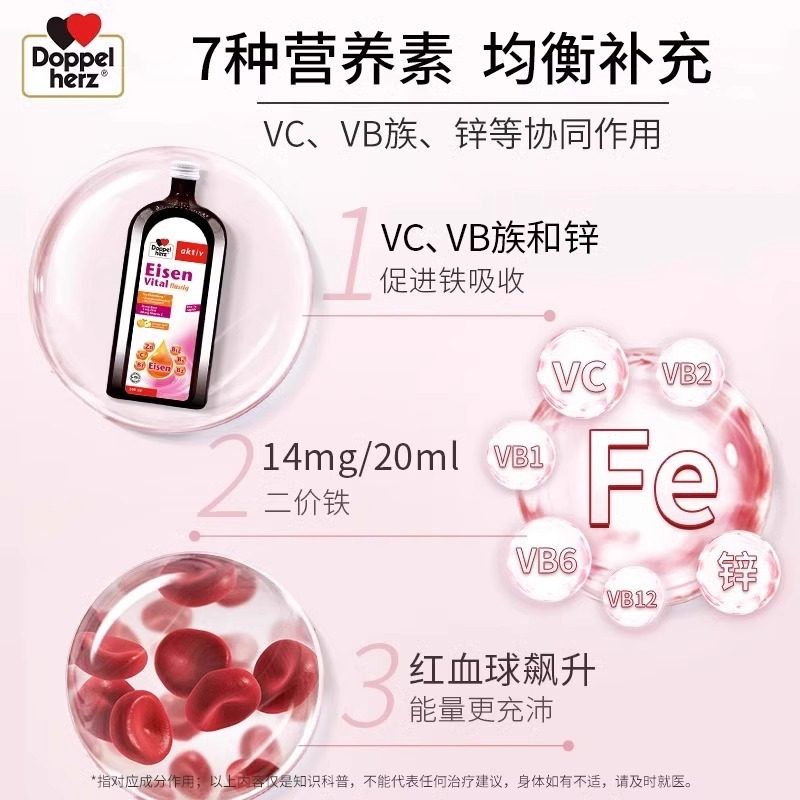 德国双心补铁口服液VBVC维生素女性孕期备孕产后补铁剂补血500ml