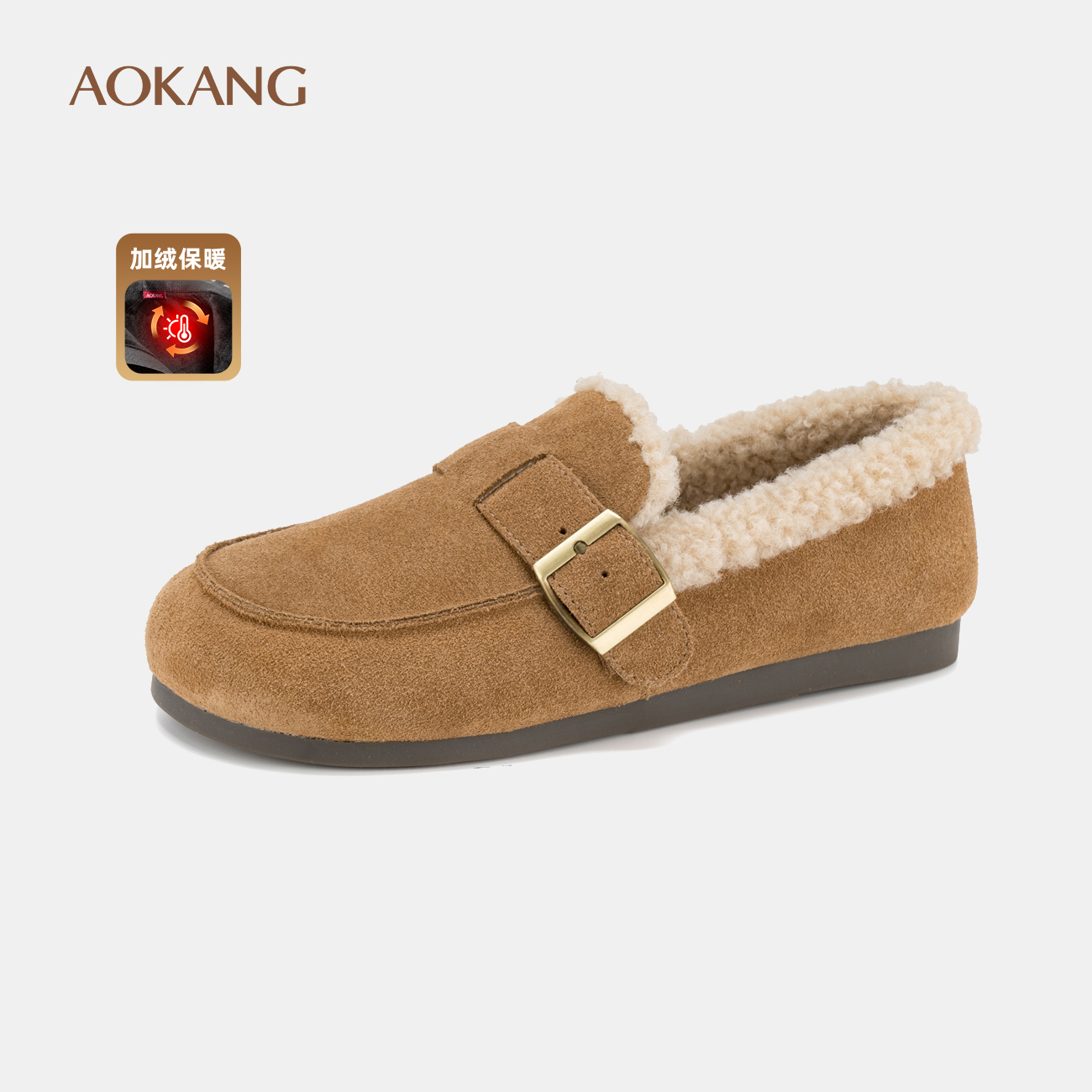 奥康女鞋 冬季真皮泰迪绒套脚加绒雪地靴平底保暖毛毛鞋