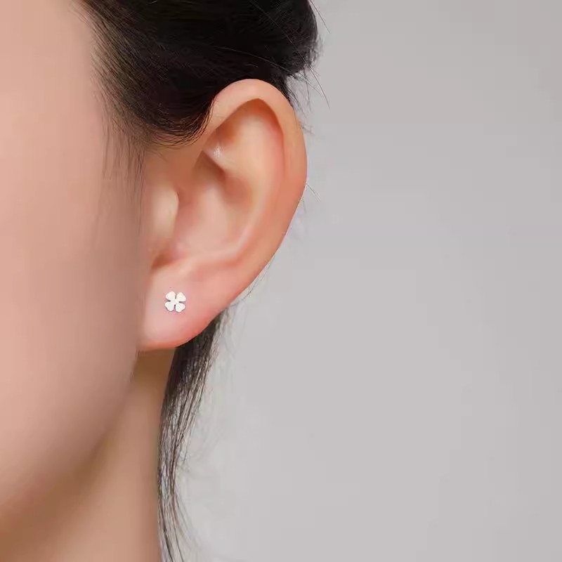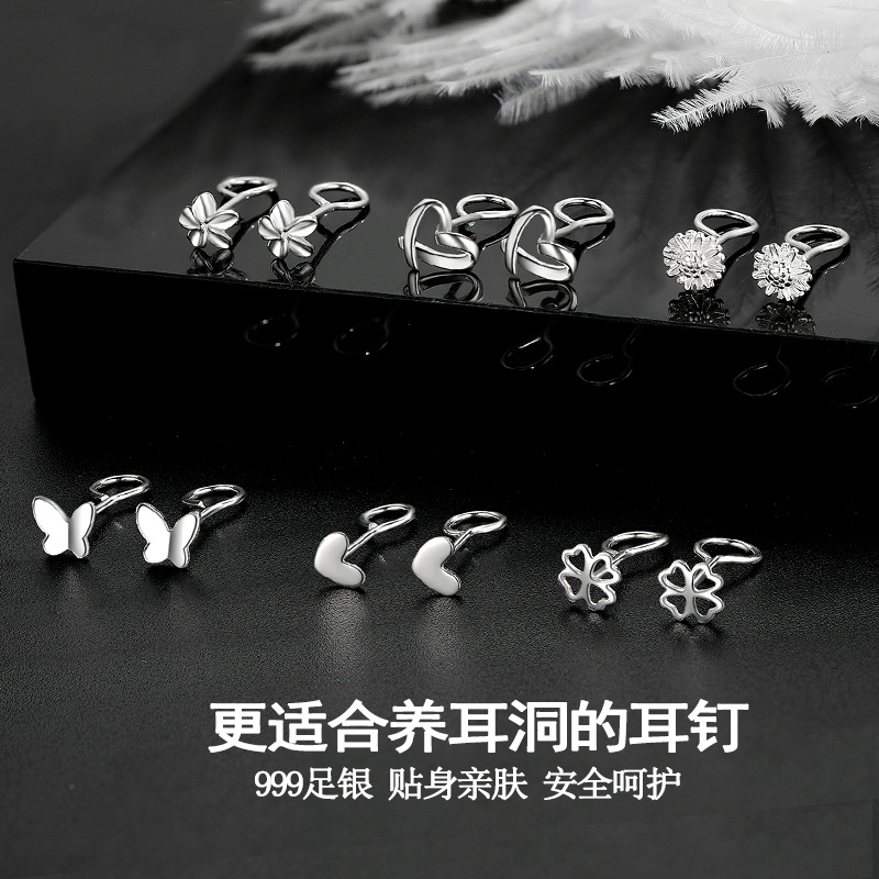 s999纯银弯钩耳钉女蝴蝶足银四叶草耳针小众时尚耳骨钉新耳洞耳饰