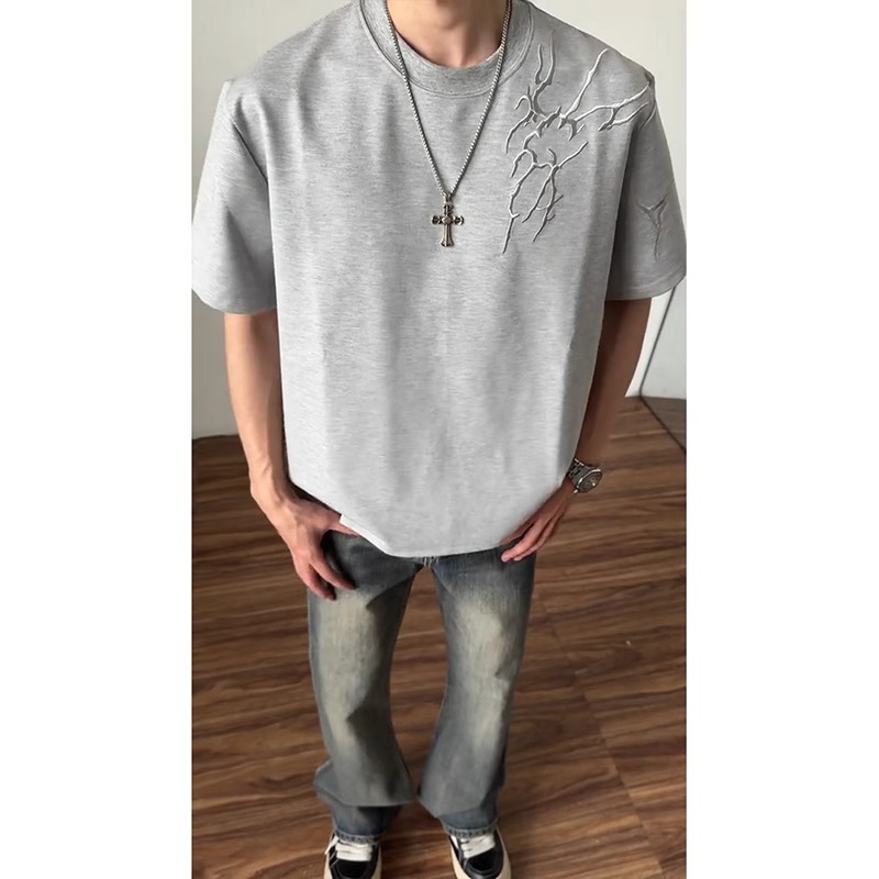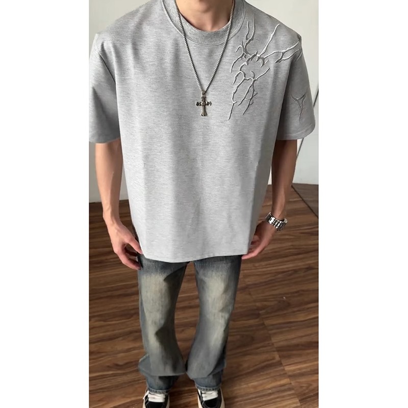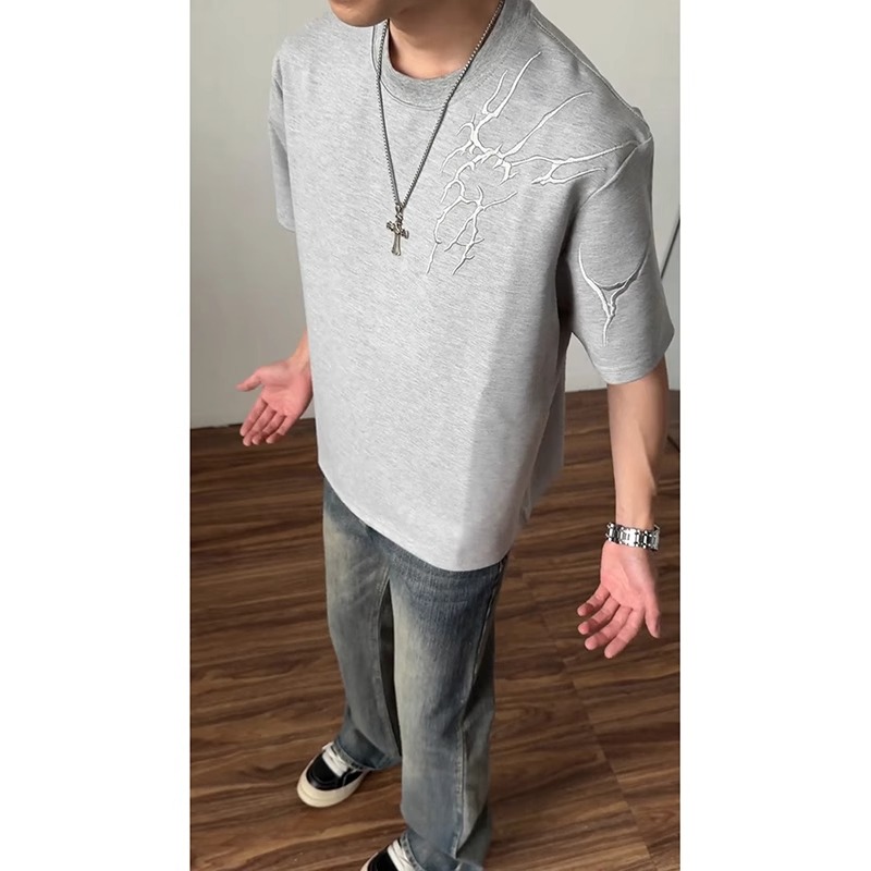 花灰色暗纹闪电刺绣t恤男款夏季300g重磅美式复古短袖高街半截袖