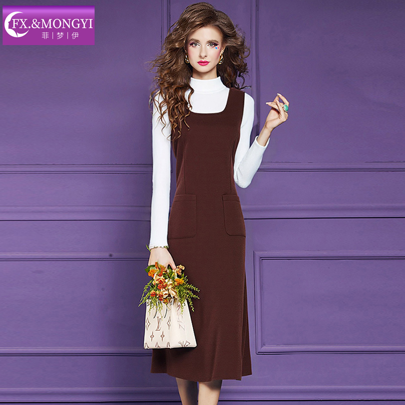 菲梦伊省心搭配套装女秋季半高领针织打底衫t恤上衣毛呢背心裙子