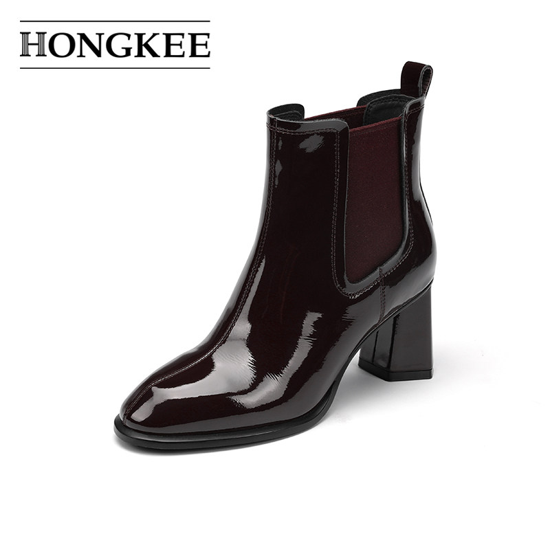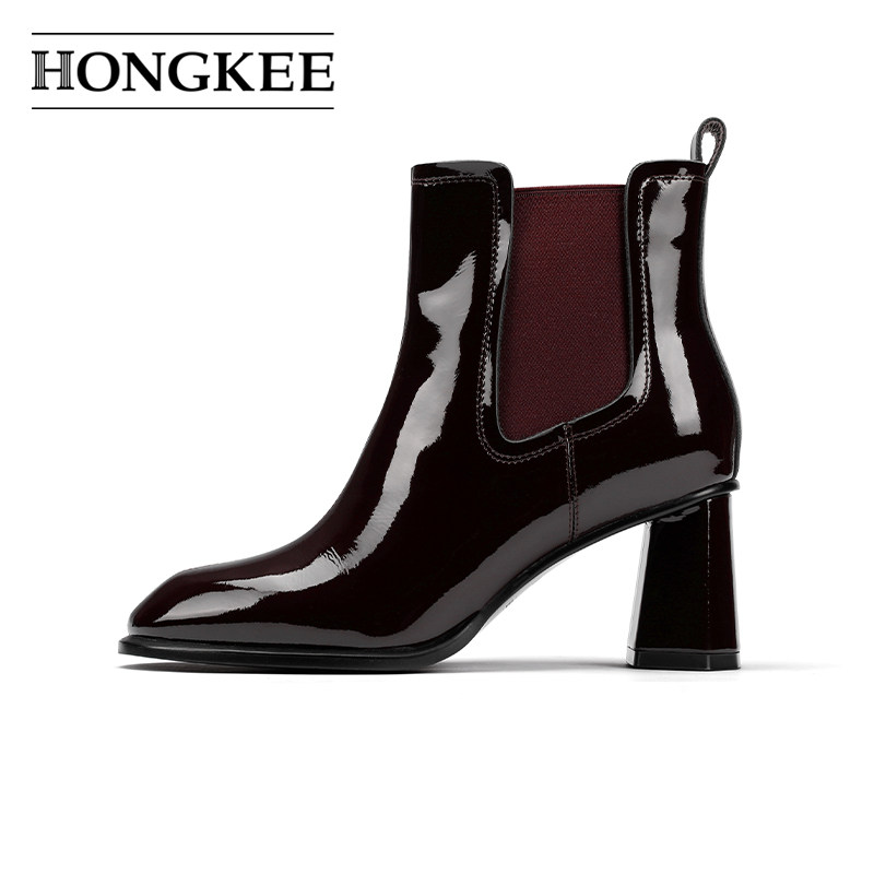 Hongkee/红科2024秋冬新款高跟短靴牛漆皮粗跟时尚女靴子H814D402