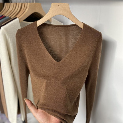 100纯羊毛内搭针织上衣秋冬季修身薄款V领超细美丽诺打底衫女长袖