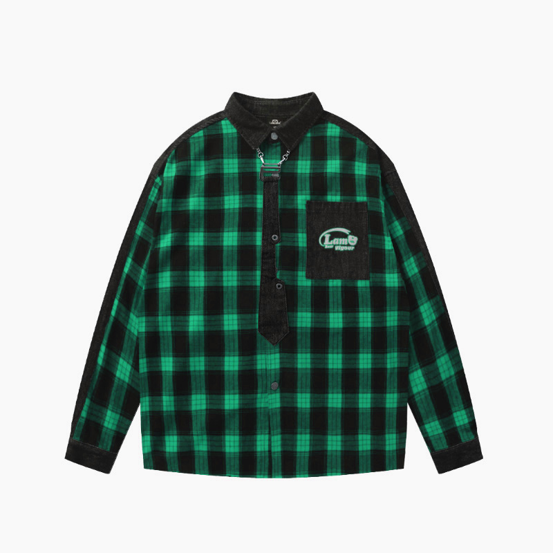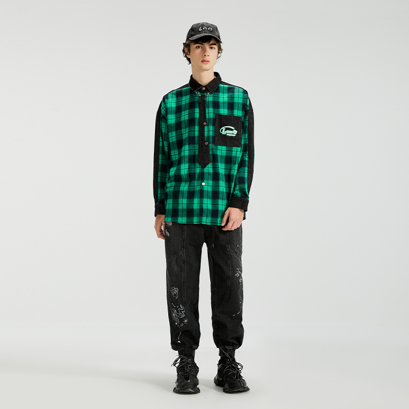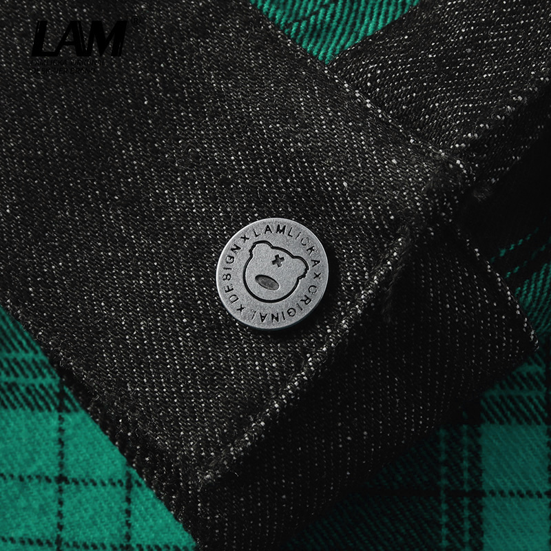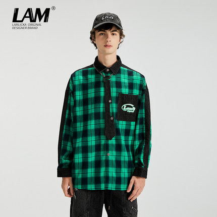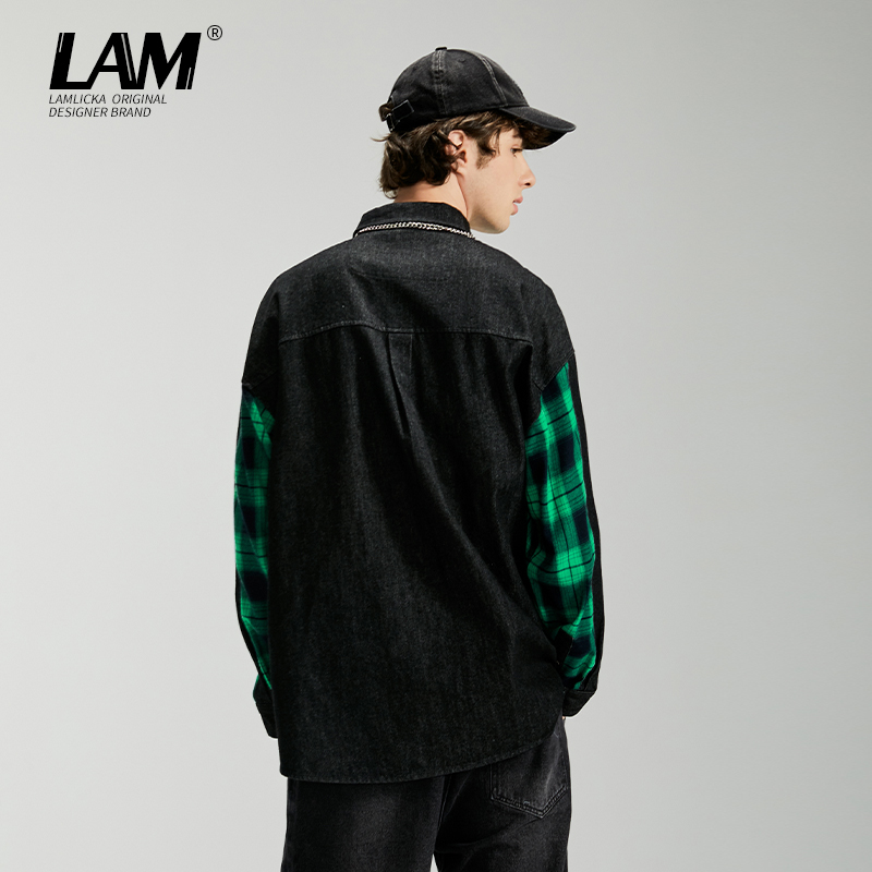 LAMLICKA美式复古格子布拼接牛仔长袖衬衫男oversize薄款翻领上衣