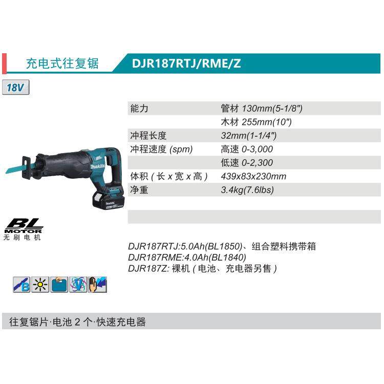 牧田Makita充电式往复锯DJR187RTJ/RME/Z无刷锂电18V