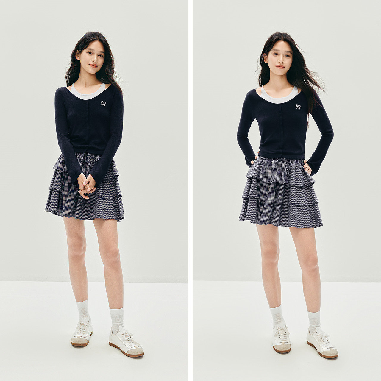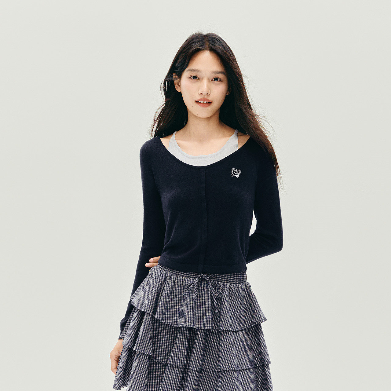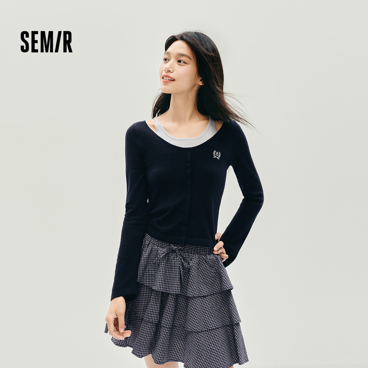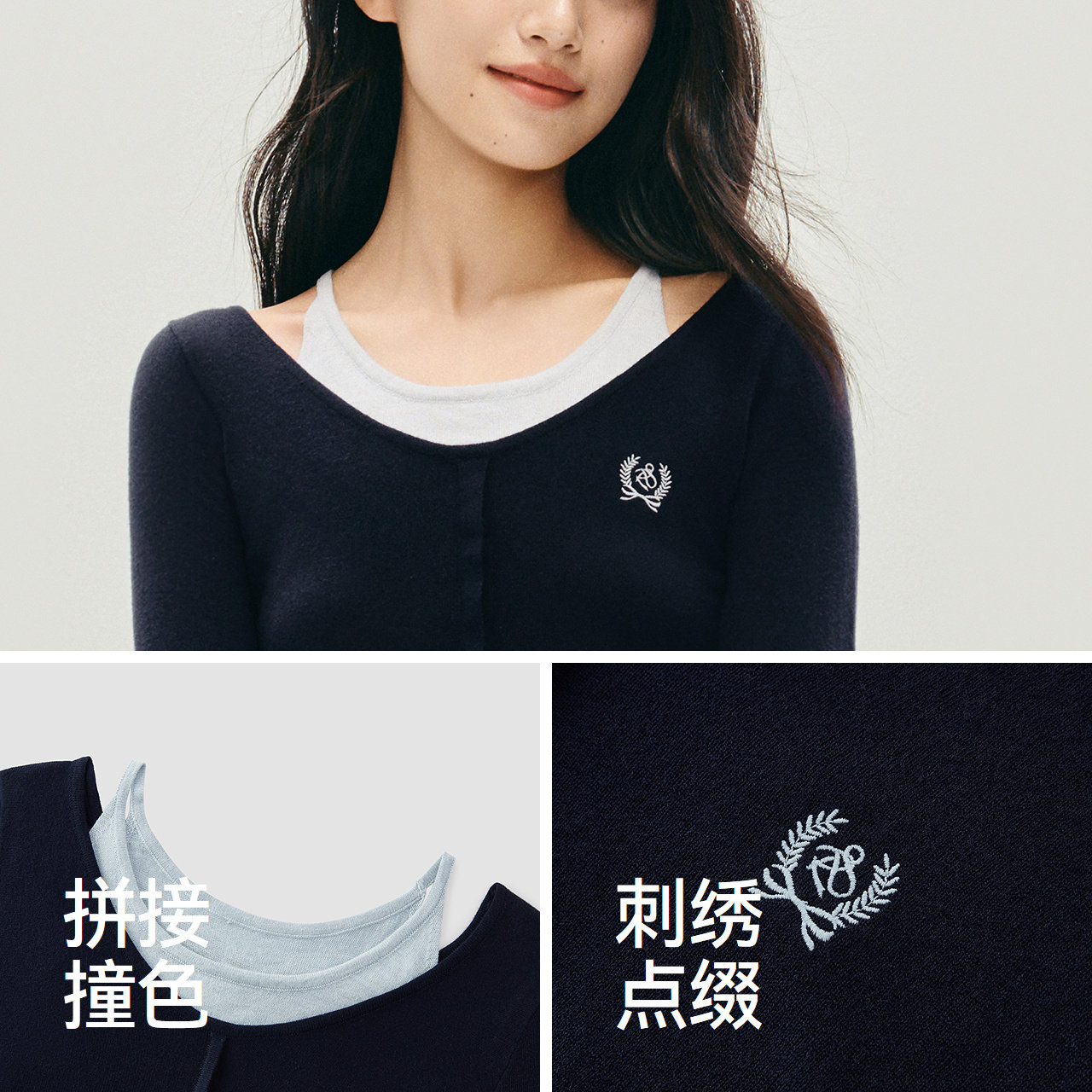森马假两件刺绣修身短款针织衫女