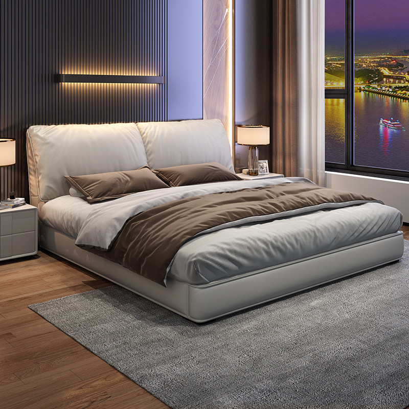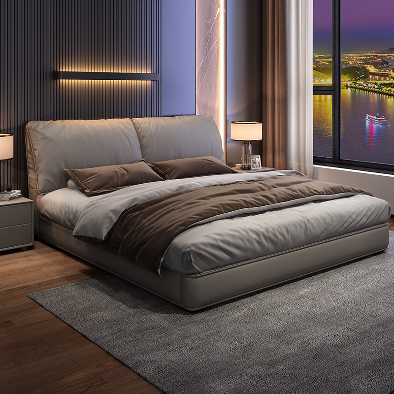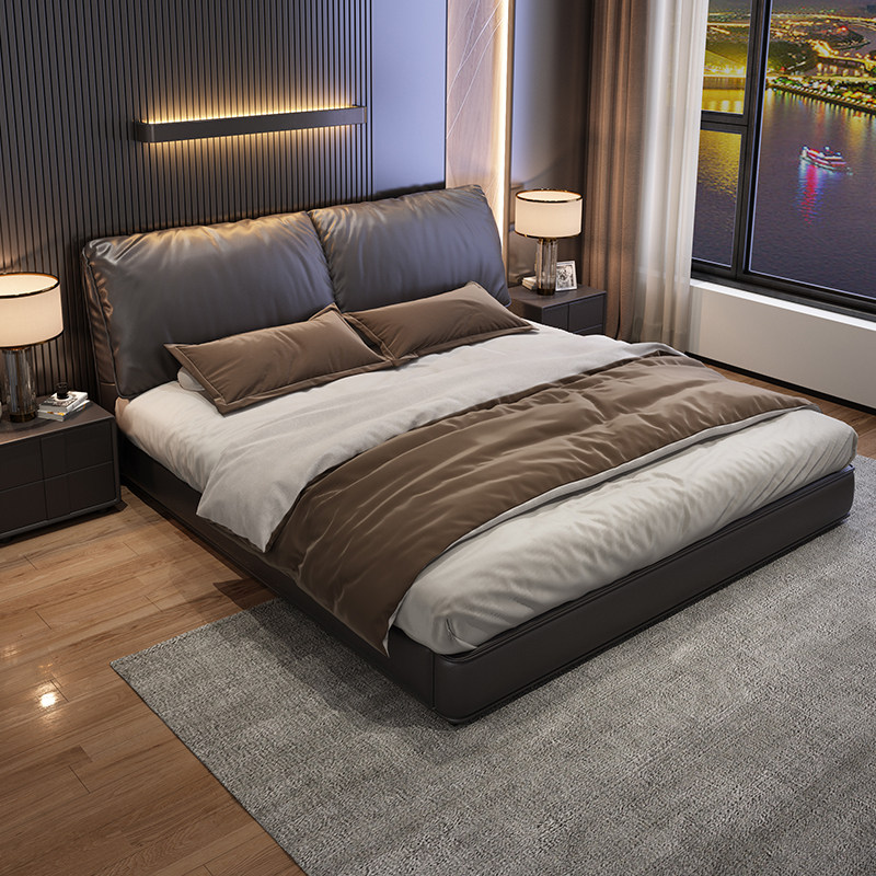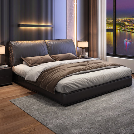 全友家居大象耳朵真皮床头层牛皮双人主卧大床2米x2米2现代简约黑