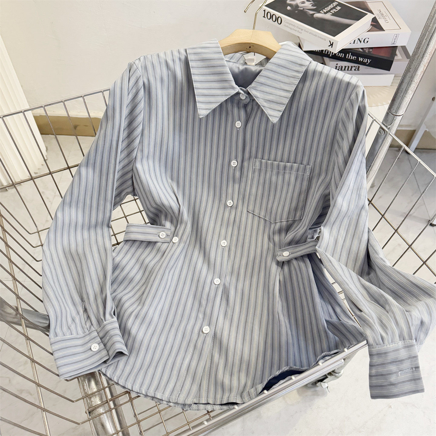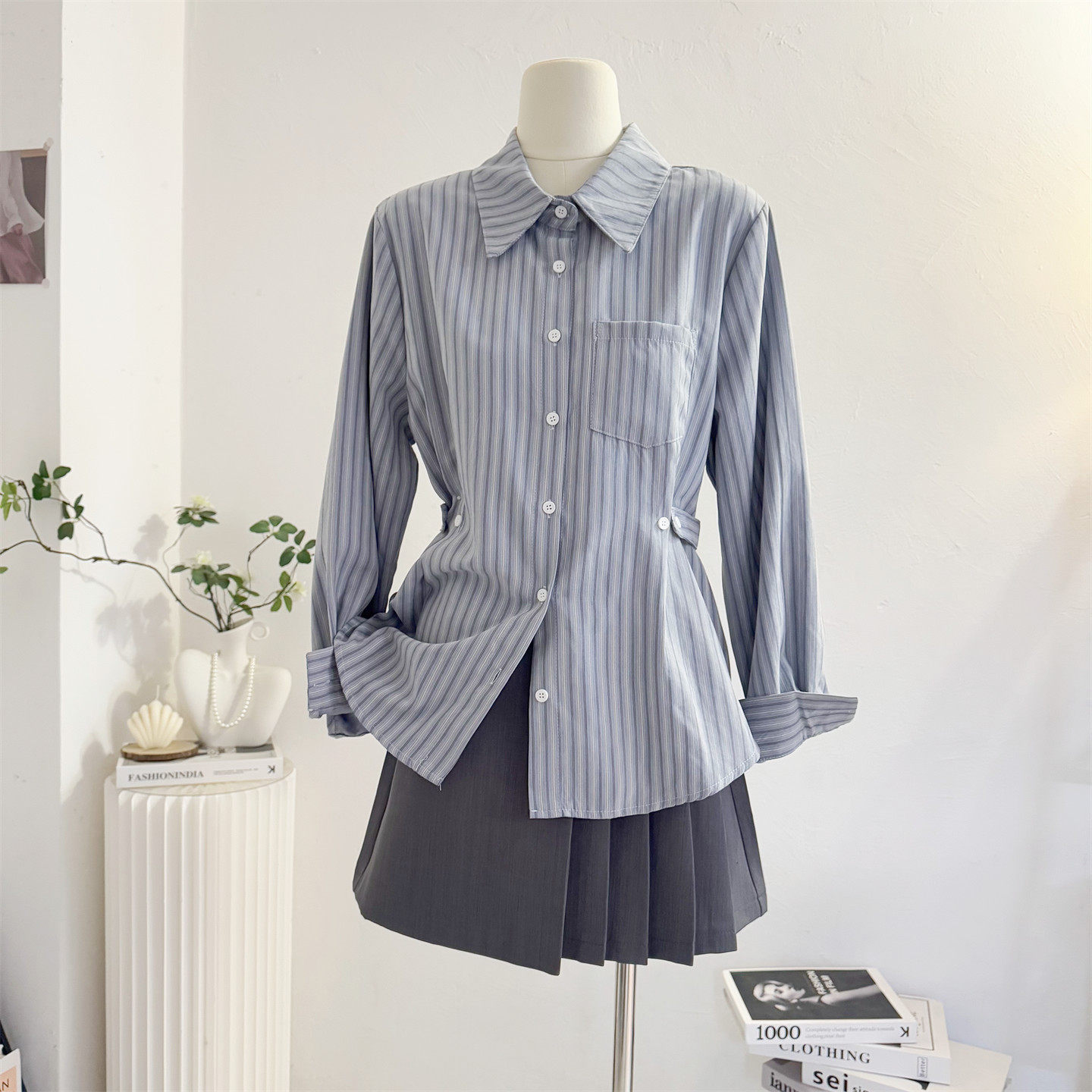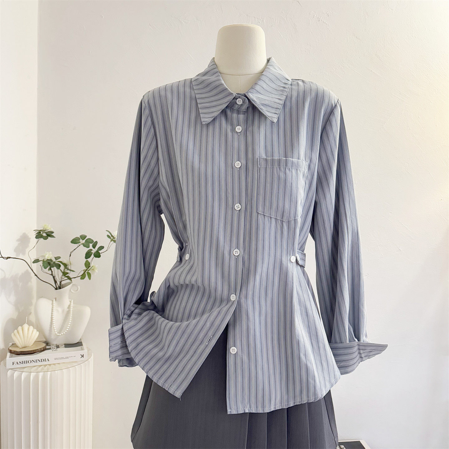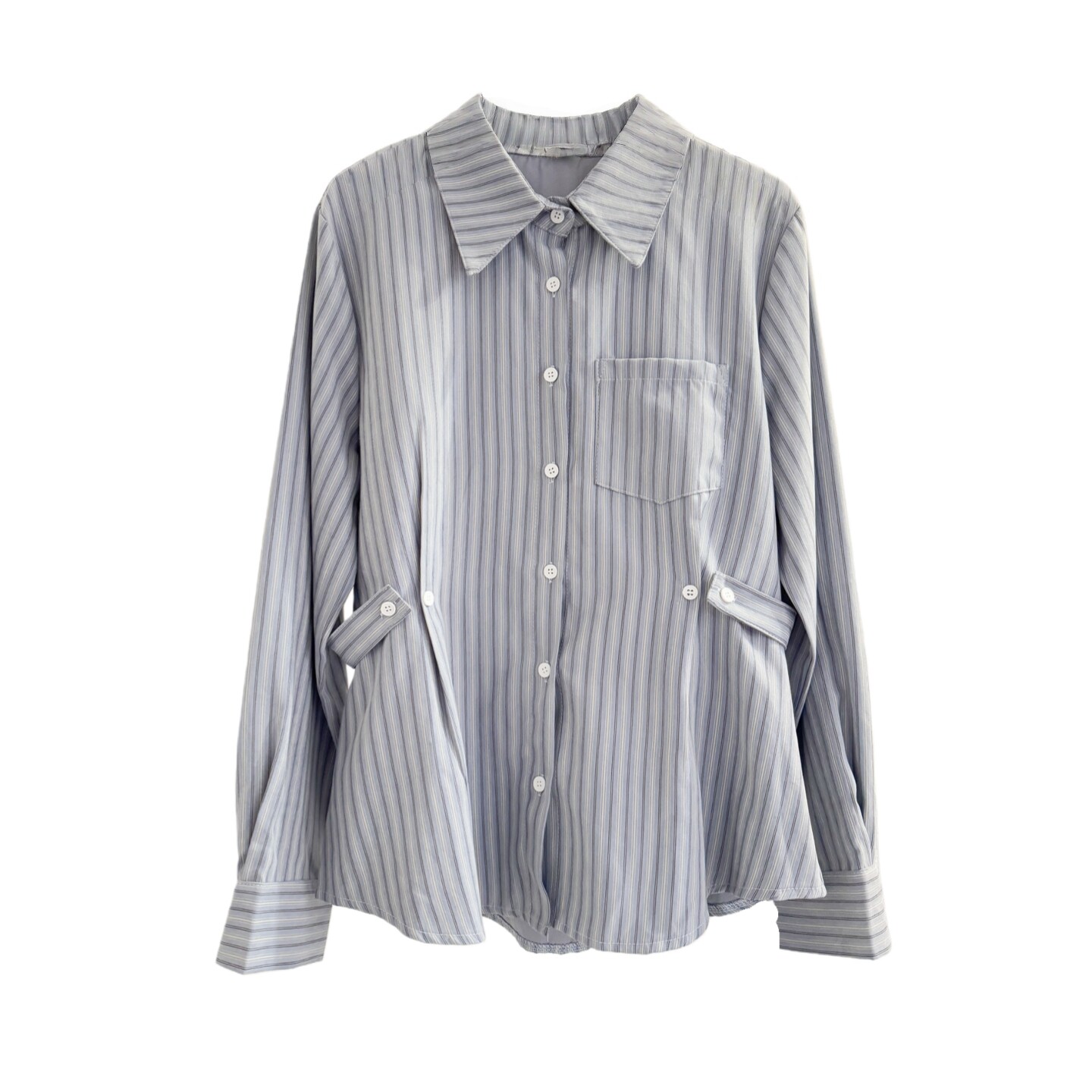 韩系气质收腰蓝色条纹长袖衬衫女