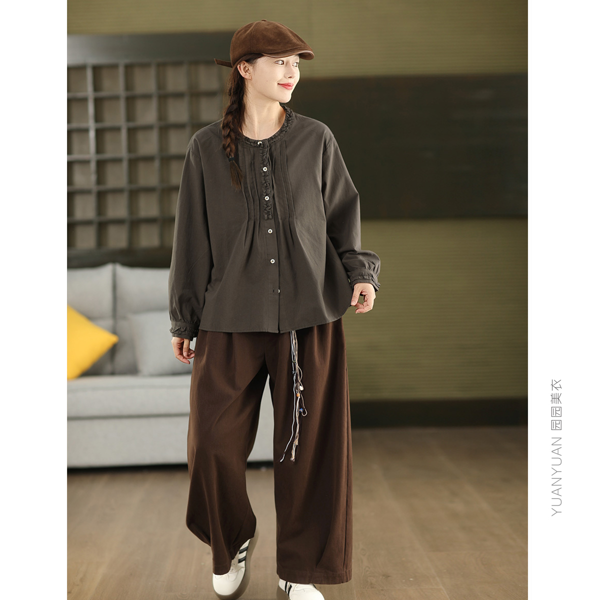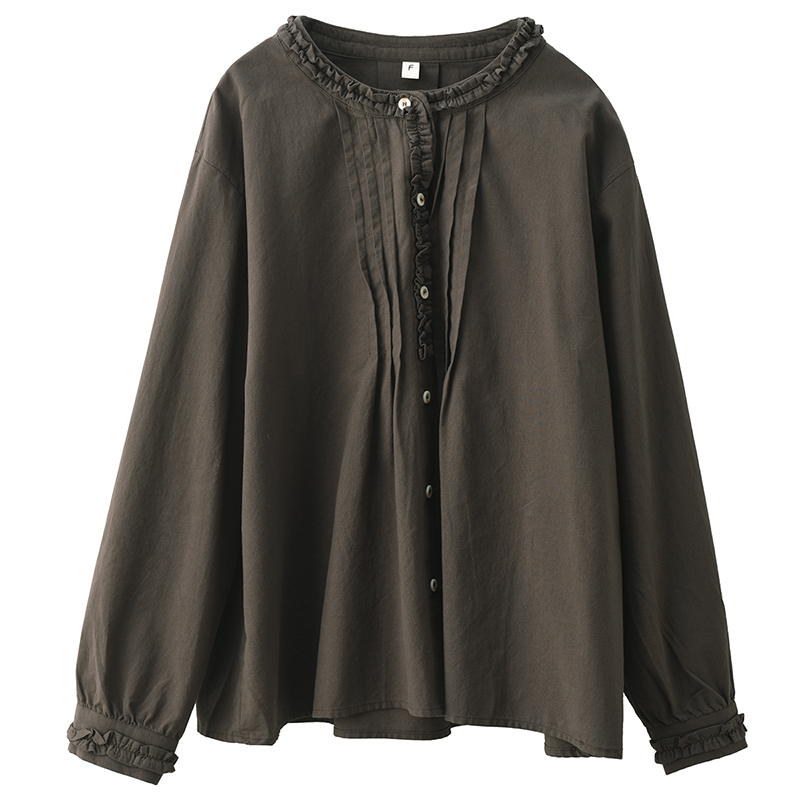 园园美衣复古100%棉衬衫女文艺木耳边长袖全棉衬衫风琴褶长袖上衣
