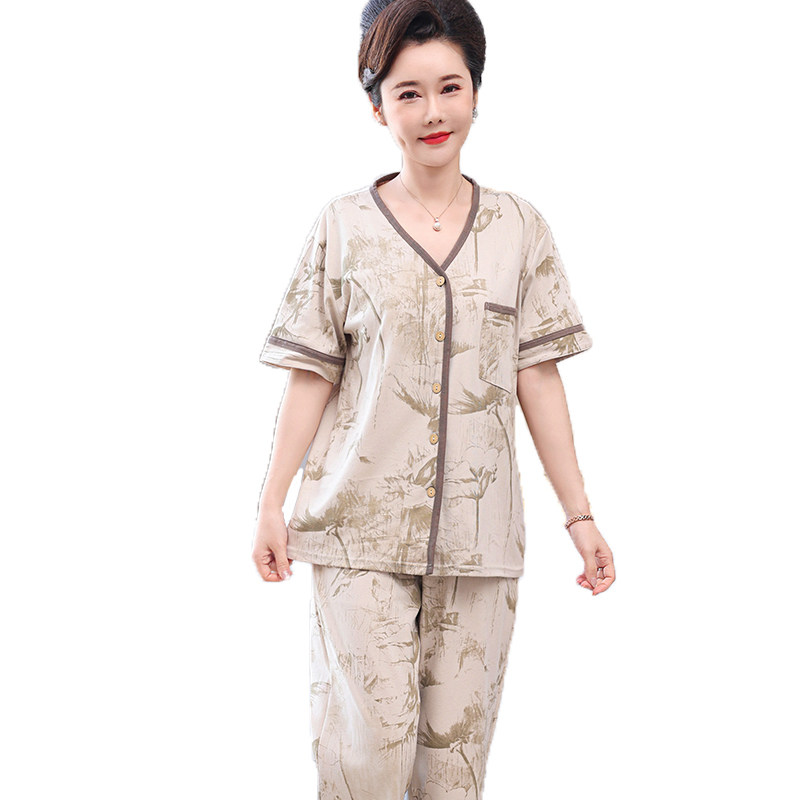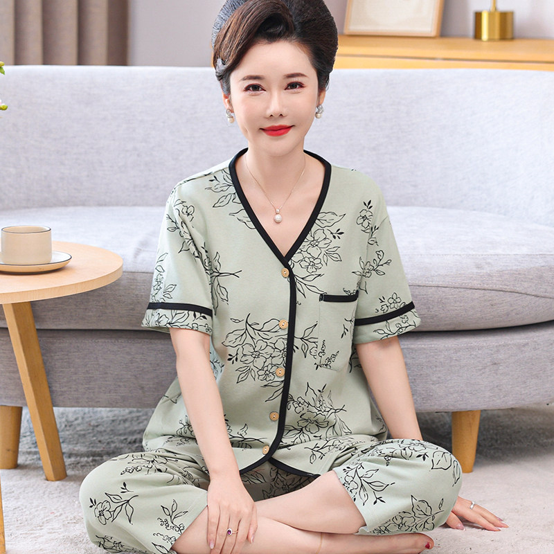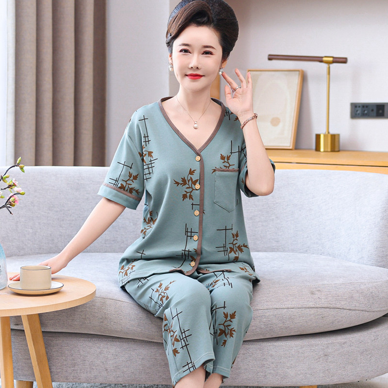 春夏季妈妈睡衣女开衫薄款纯棉大码宽松短袖九分裤中老年人家居服
