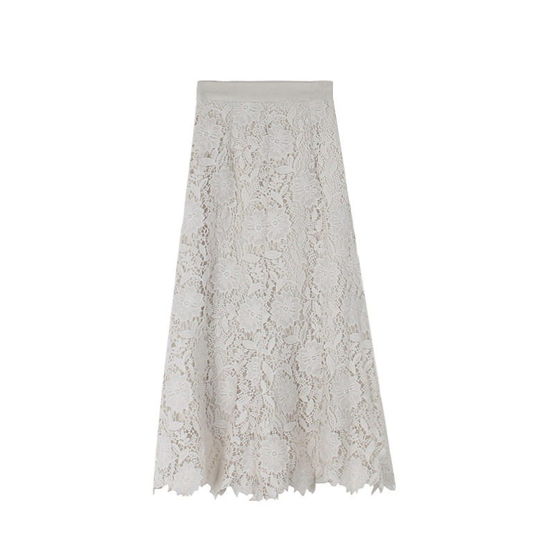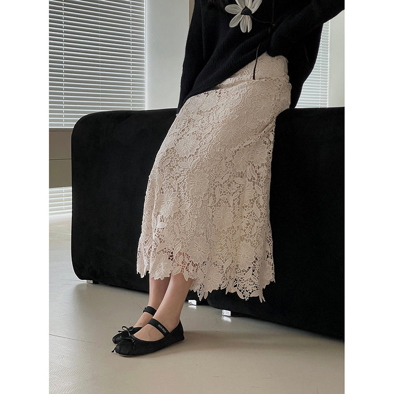 法式复古杏色高腰蕾丝半身裙女春夏高级感镂空A字长裙鱼尾包臀裙