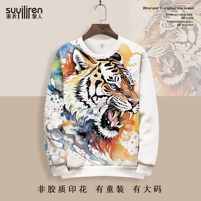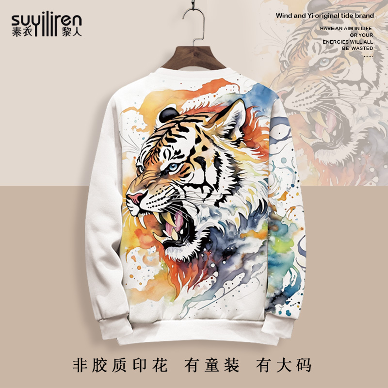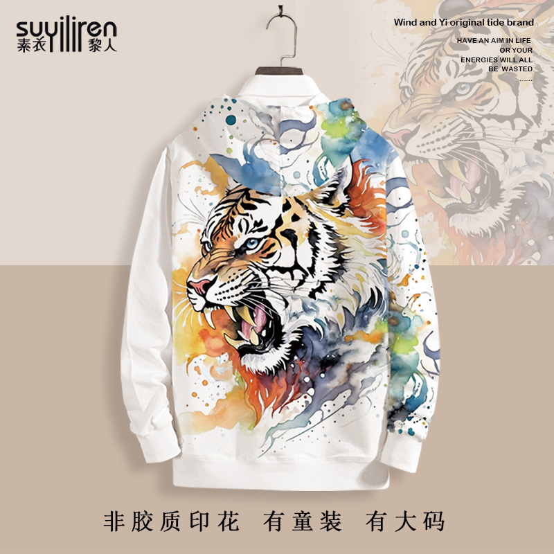 连帽卫衣外套男设计感小众中国风老虎头印花套头上衣新款大码衣服