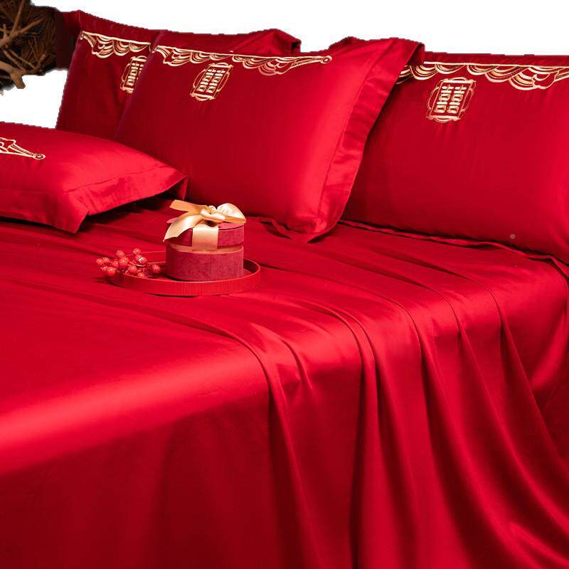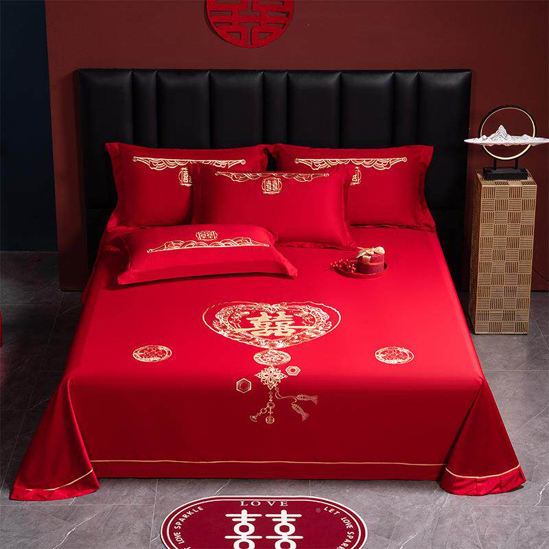 新款80长绒棉婚三件套绣纯45175161棉刺庆红色床单支单件结婚陪嫁