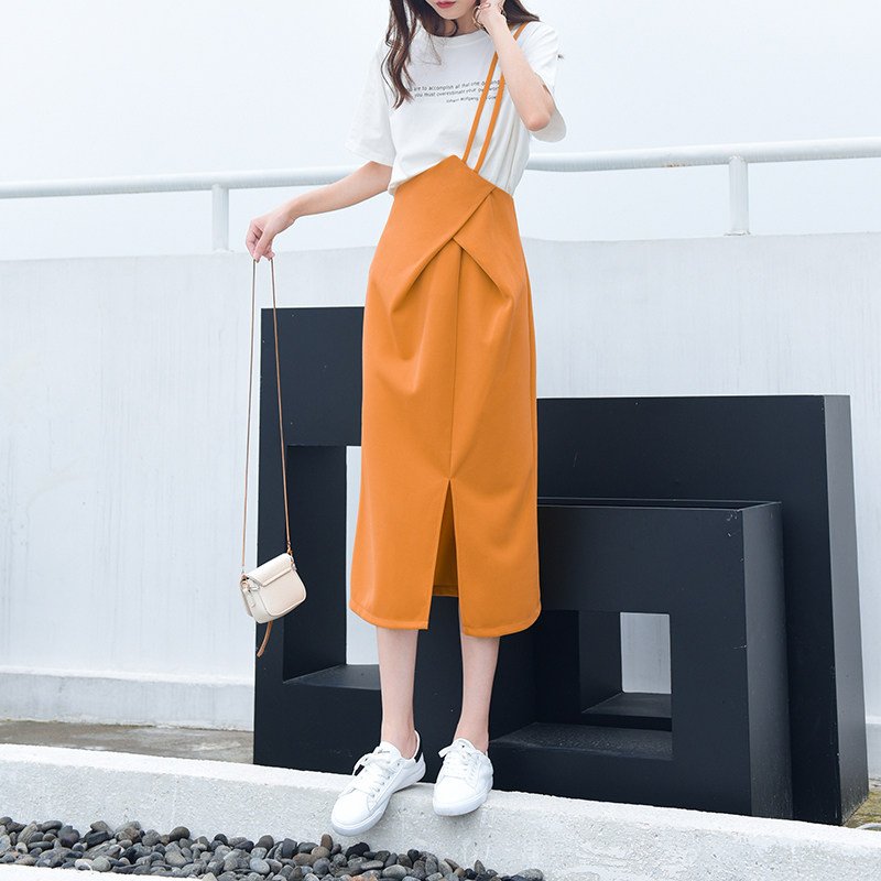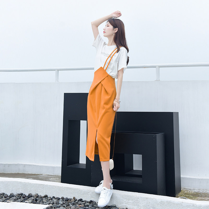 高腰半身裙女夏季时尚小众设计感显瘦不规则中长裙减龄斜背带裙