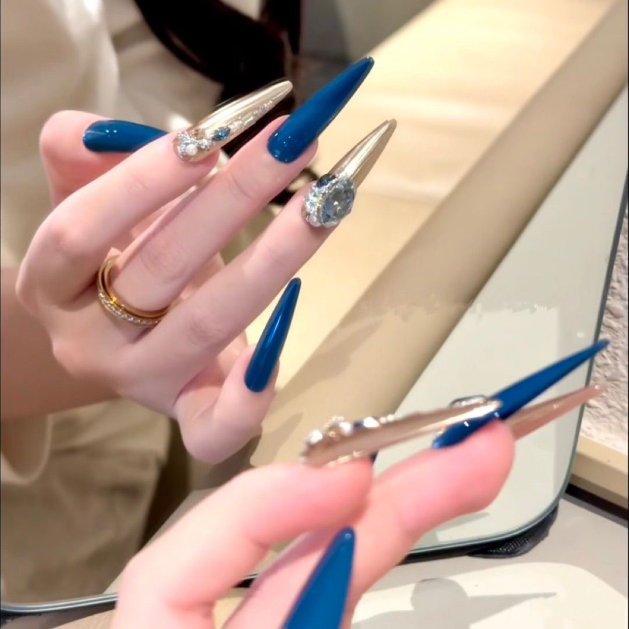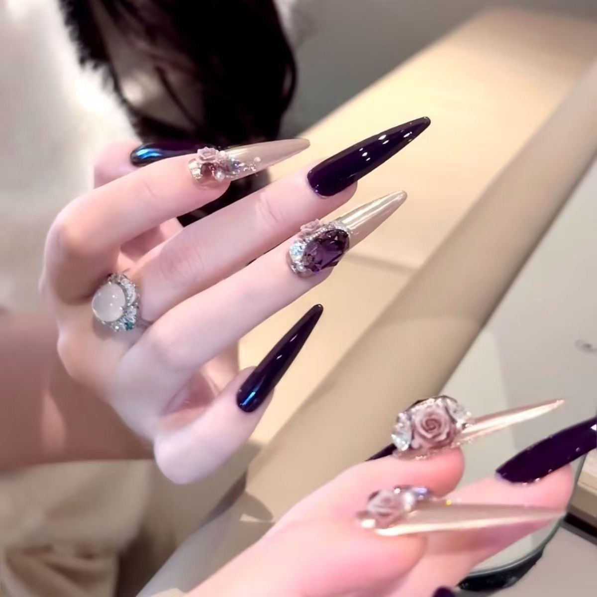 纯手工美甲穿戴甲富家千金感玫红色魔镜粉爆闪碎钻长款美甲显白