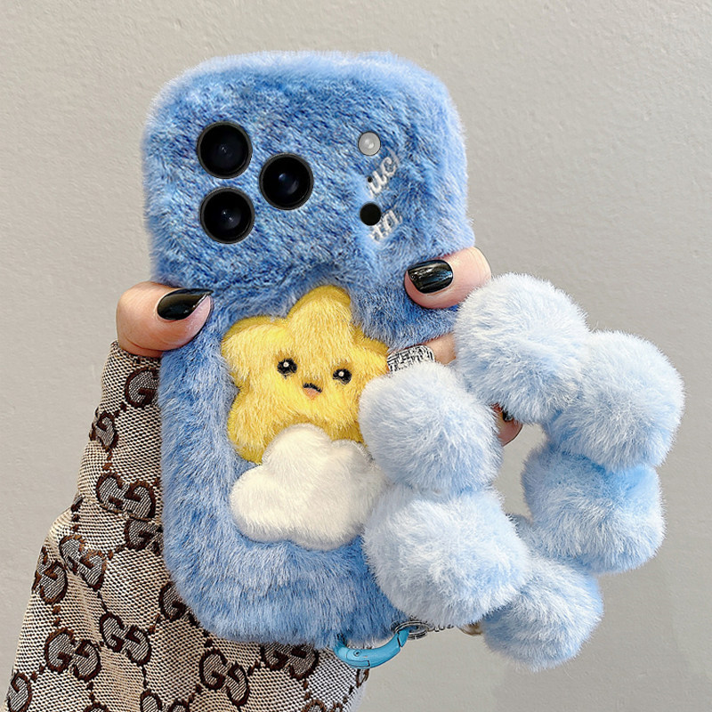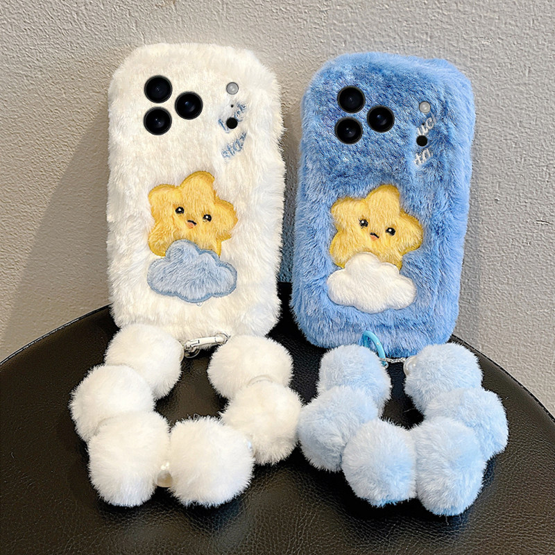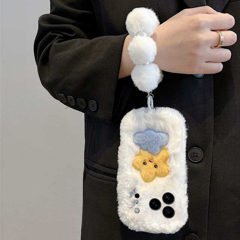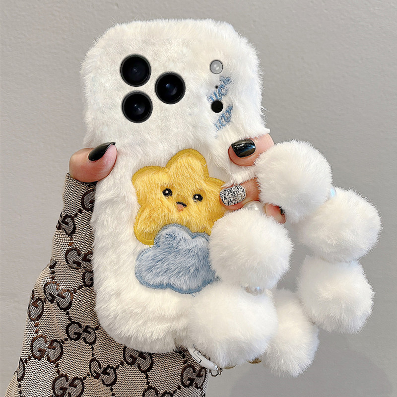 刺绣云朵星星适用苹果17promax手机壳华为pura80荣耀400pro小米15毛球vivos30挂链opporeno14秋冬季x300毛绒p