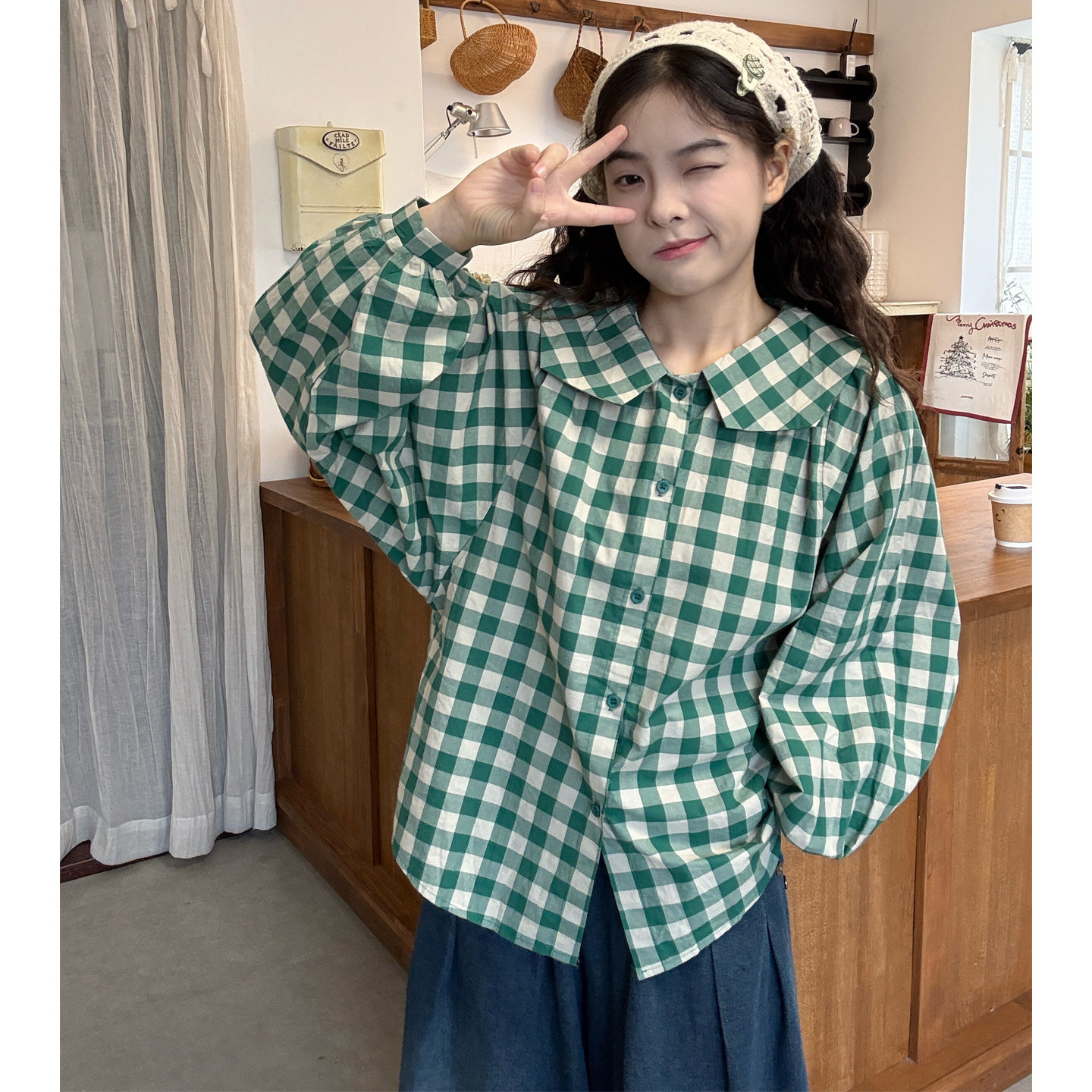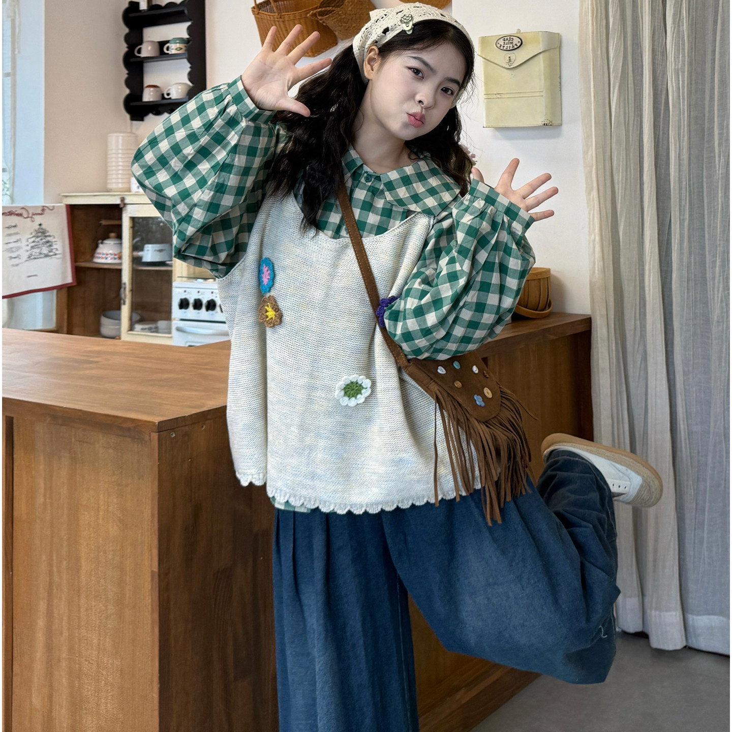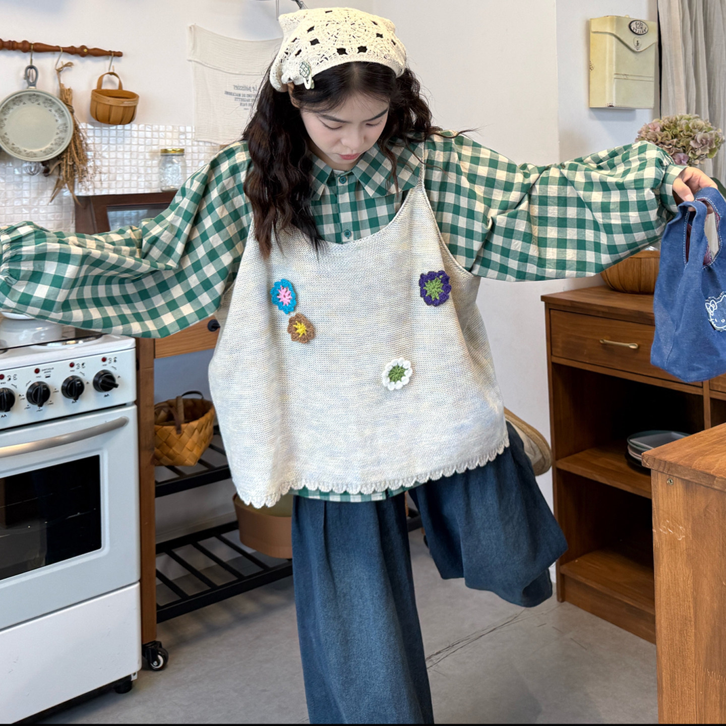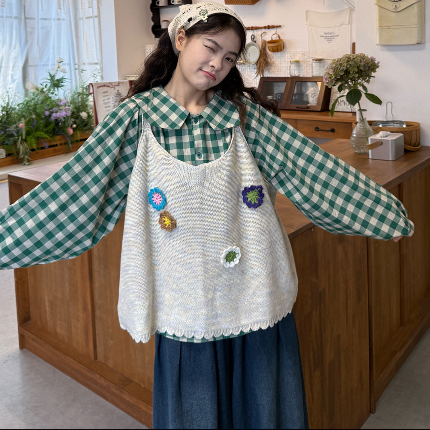 格纹衬衫花朵针织马甲牛仔裤套装