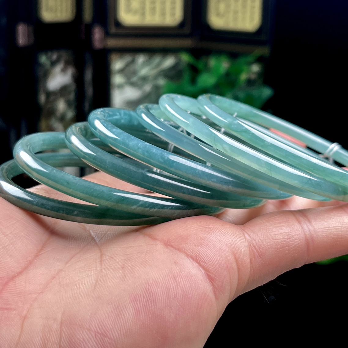 50-62圈口翡翠手镯天然A货蓝水油绿危地马拉玉石玉镯子叮当镯圆条