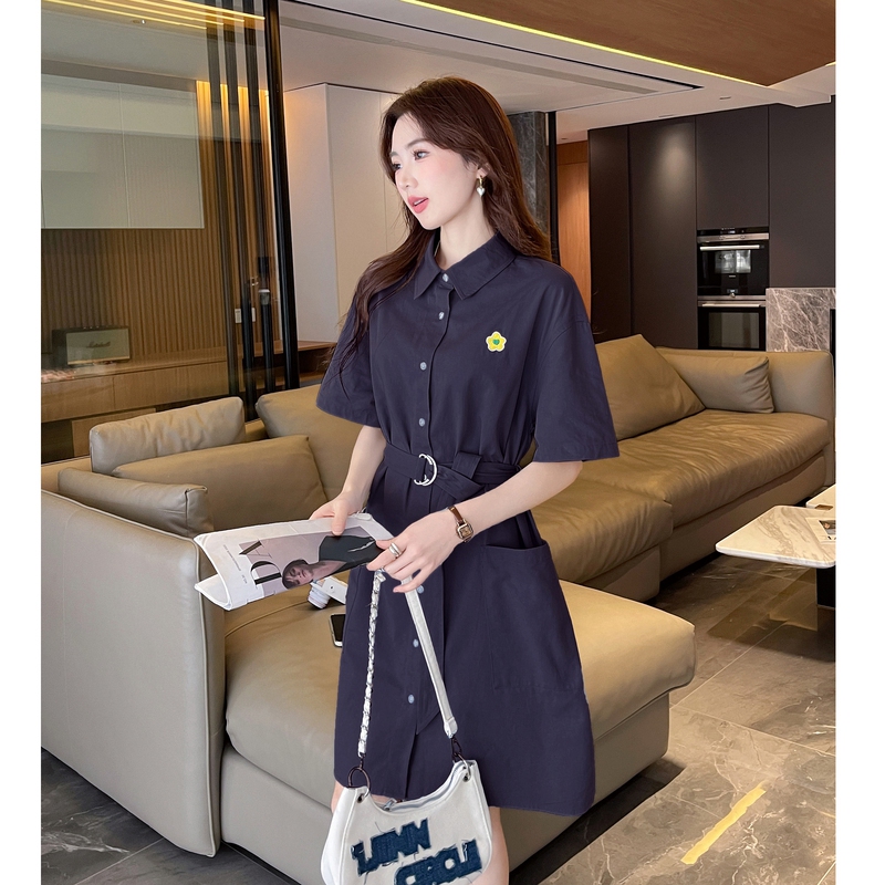 唐狮短袖衬衫连衣裙女2025夏季新款韩系翻领收腰显瘦工装气质裙子