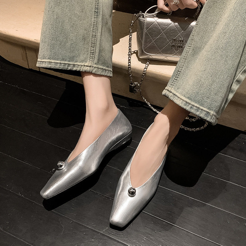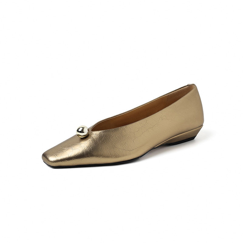 KAKY方头坡跟单鞋女V口真皮百搭小皮鞋女金银色浅口牛皮百搭2025