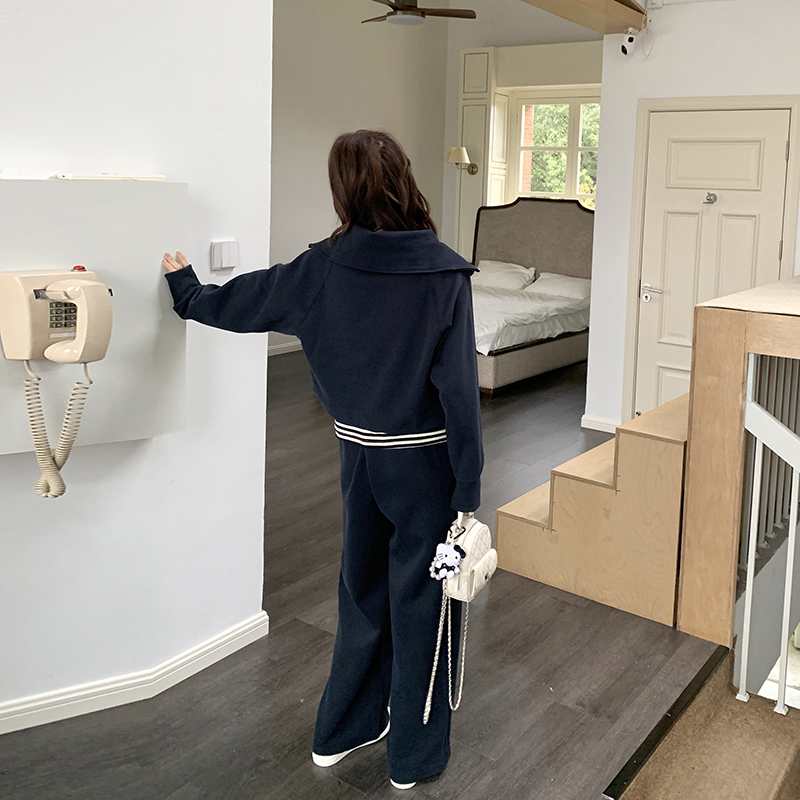 藏蓝色韩系减龄卫衣套装女秋季2025新款条纹背心休闲阔腿裤三件套