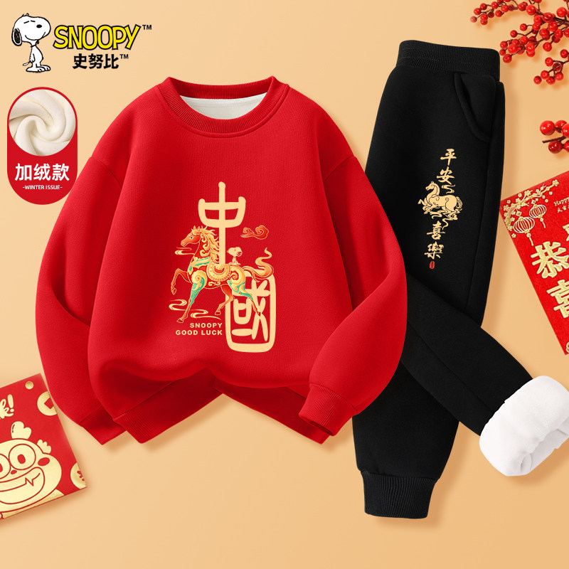 史努比男童拜年服儿童2026马年本命年衣服红色卫衣套装加绒过年服