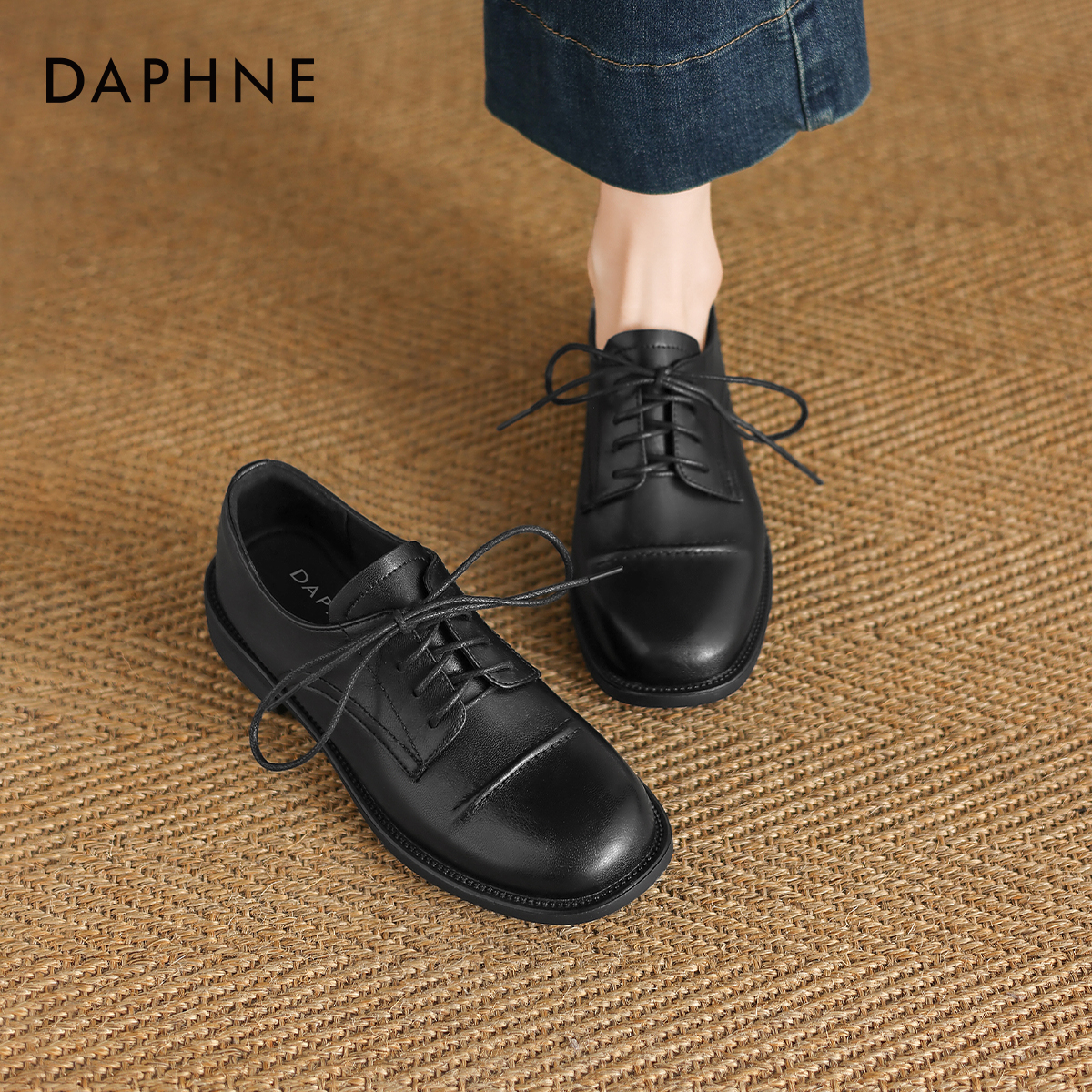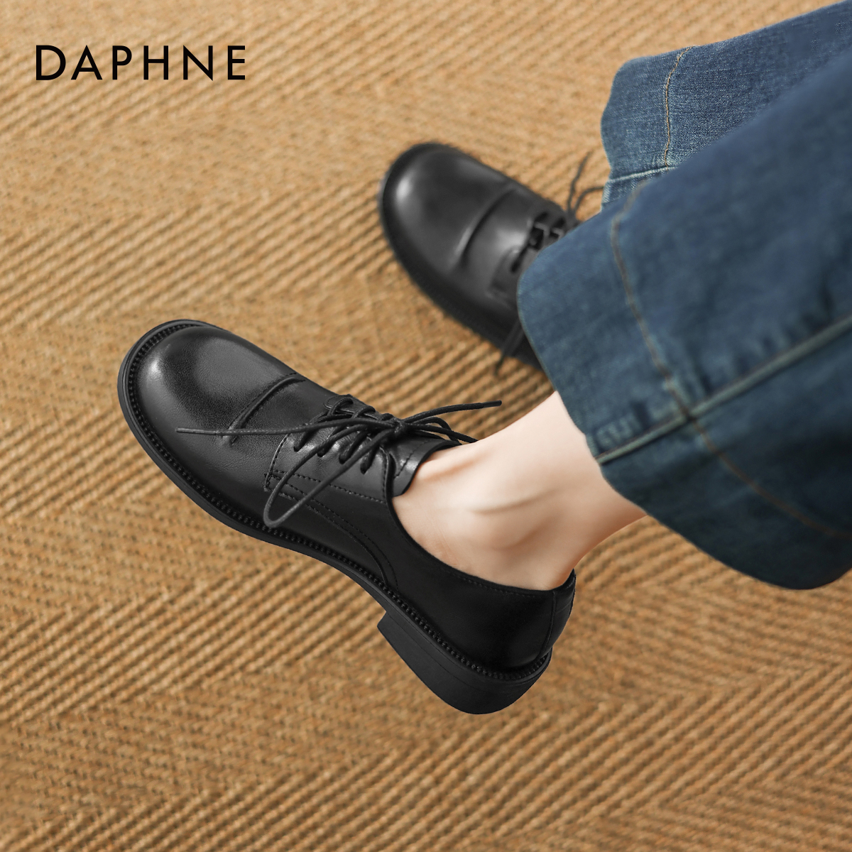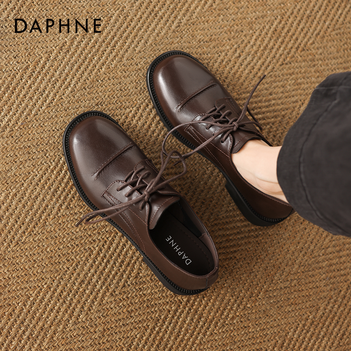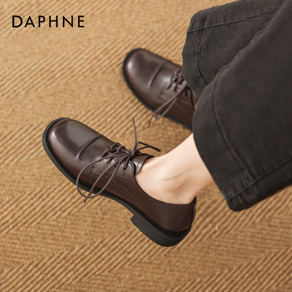 达芙妮乐福鞋女2025新款秋冬棕色英伦风小皮鞋系带布洛克深口单鞋