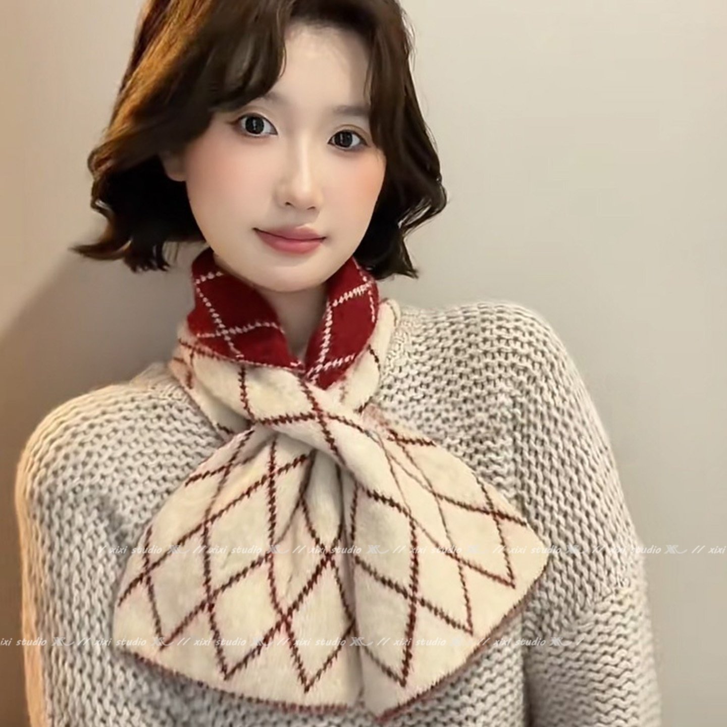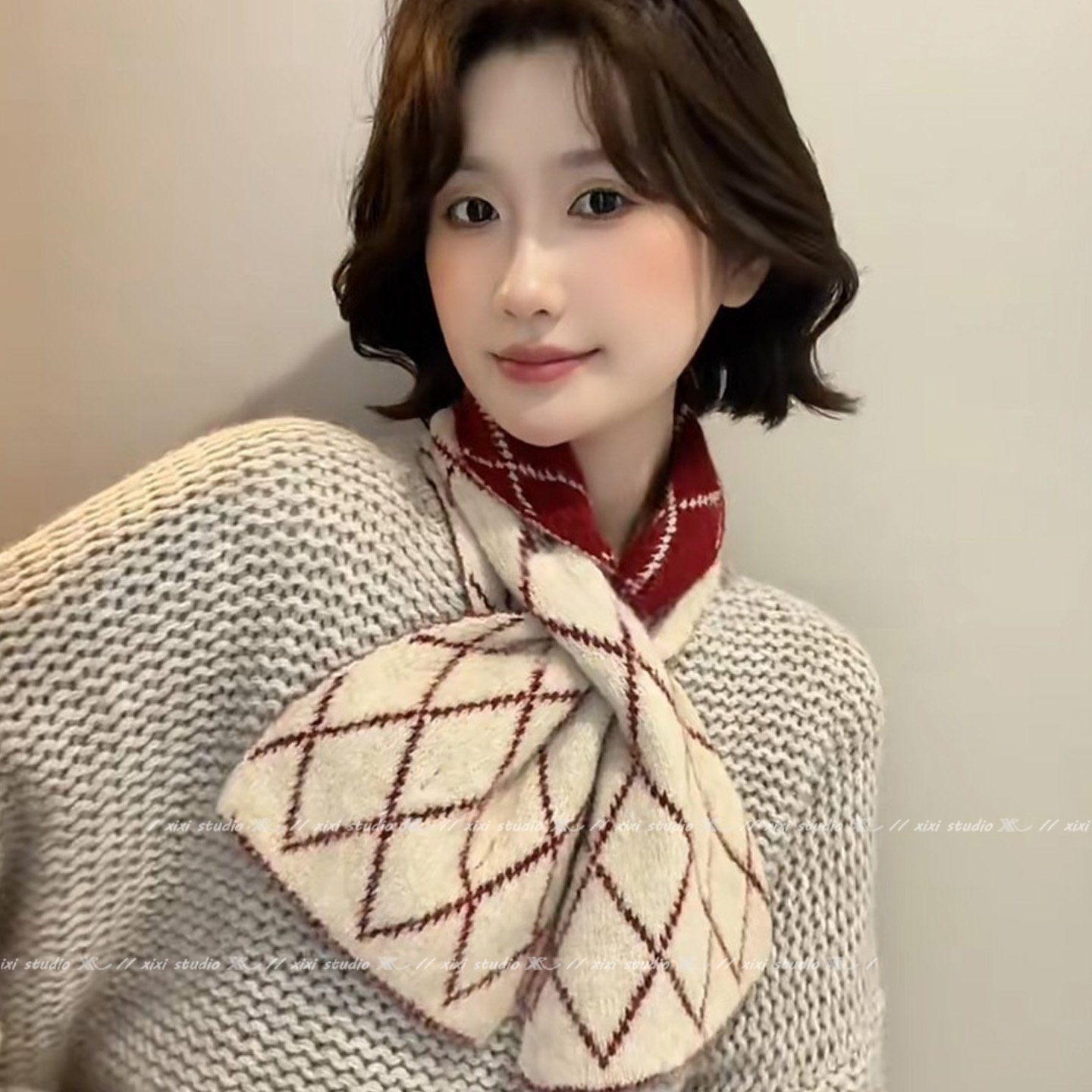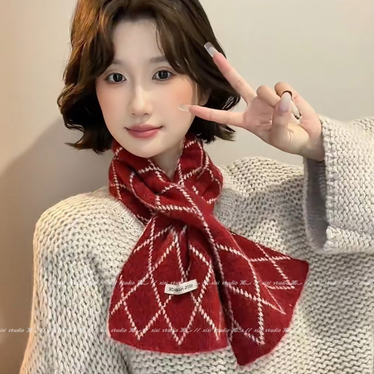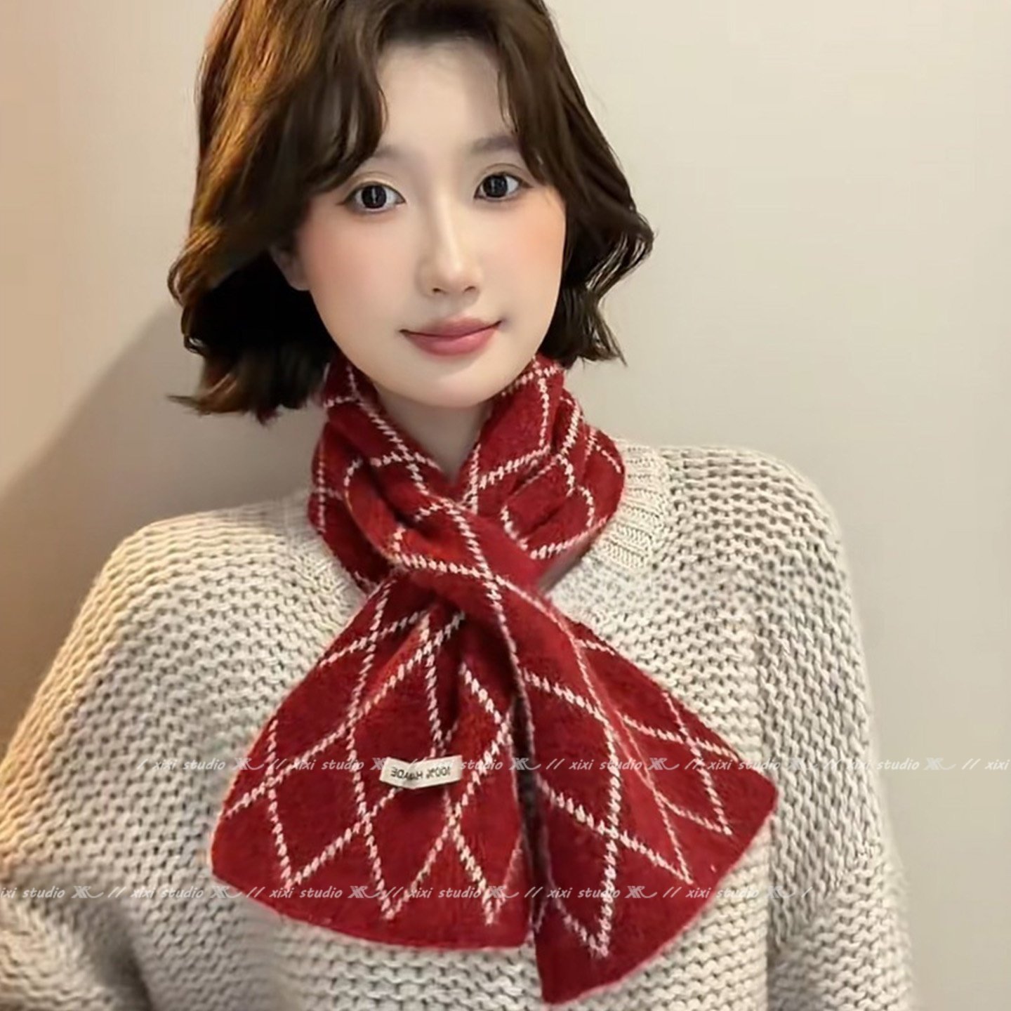 红色菱形线条羊绒交叉围巾冬季保暖防寒护颈新年氛围感围脖新品女