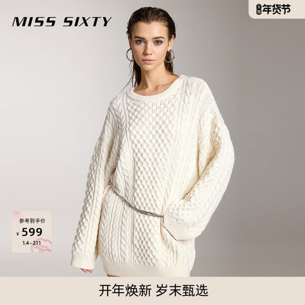 Miss Sixty附腰链羊毛针织衫上衣女圆领宽松长袖中长款两穿毛衣