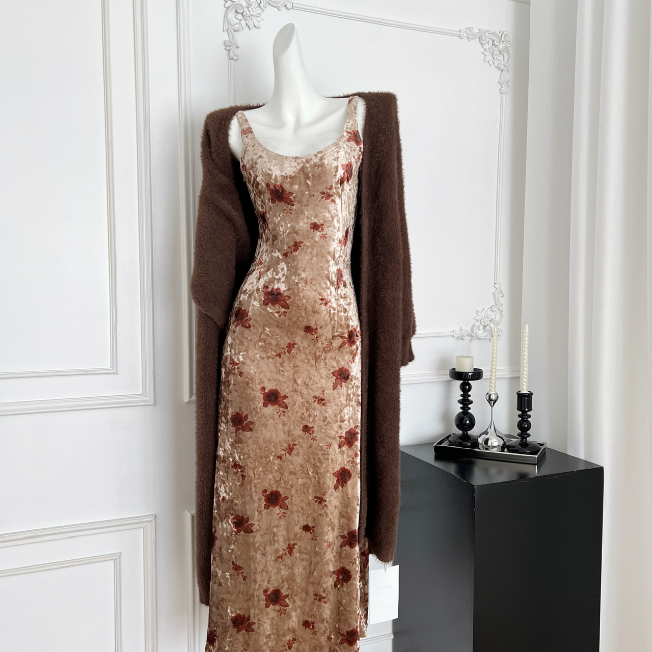 Xxiiuu 鎏金暗纹 秋冬新款丝绒吊带裙女印花a字连衣裙气质长裙子