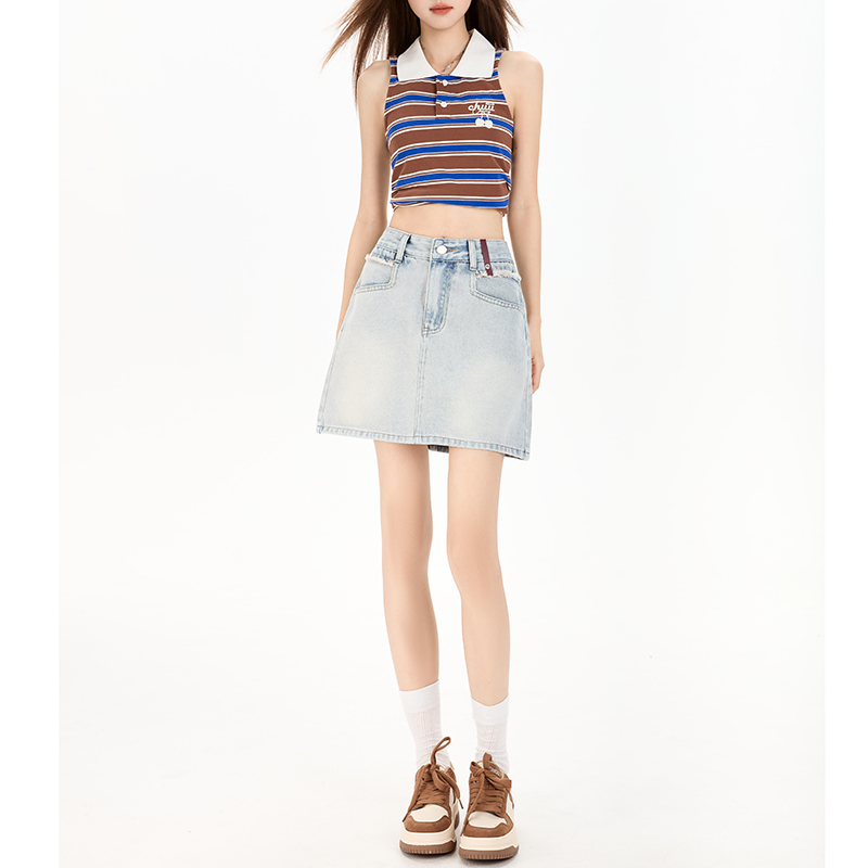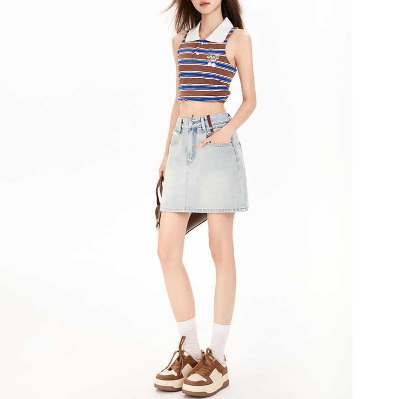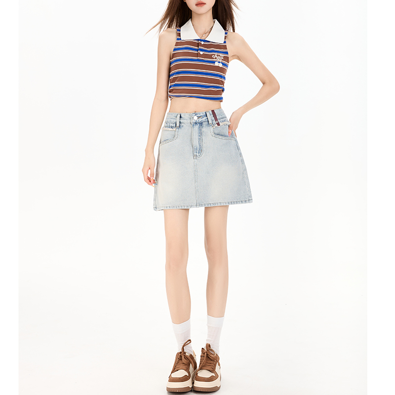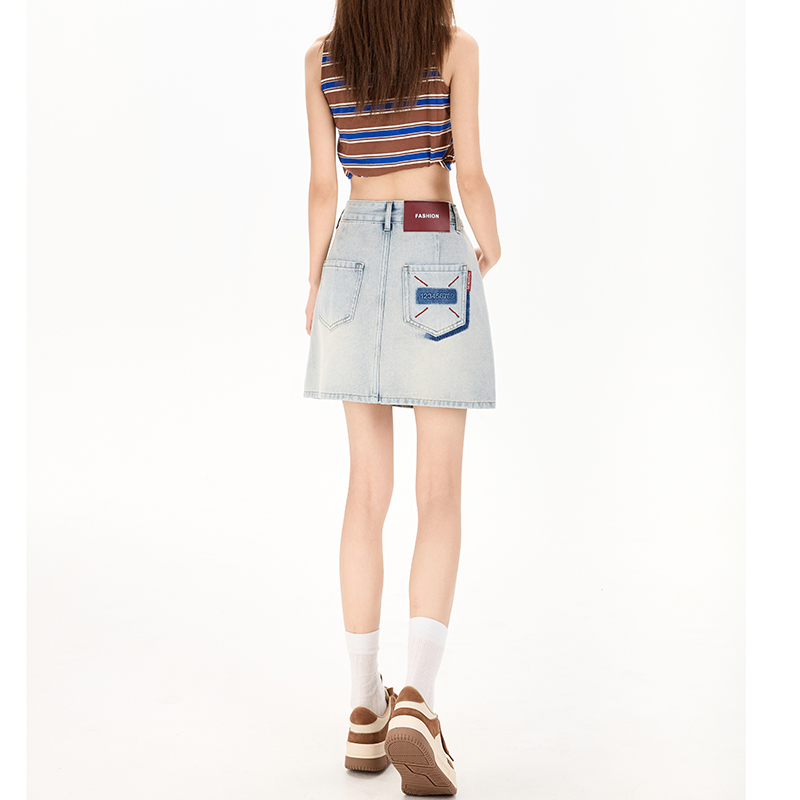 美式牛仔半身裙女2025新款夏季高腰显瘦撞色设计感宽松a字短裙