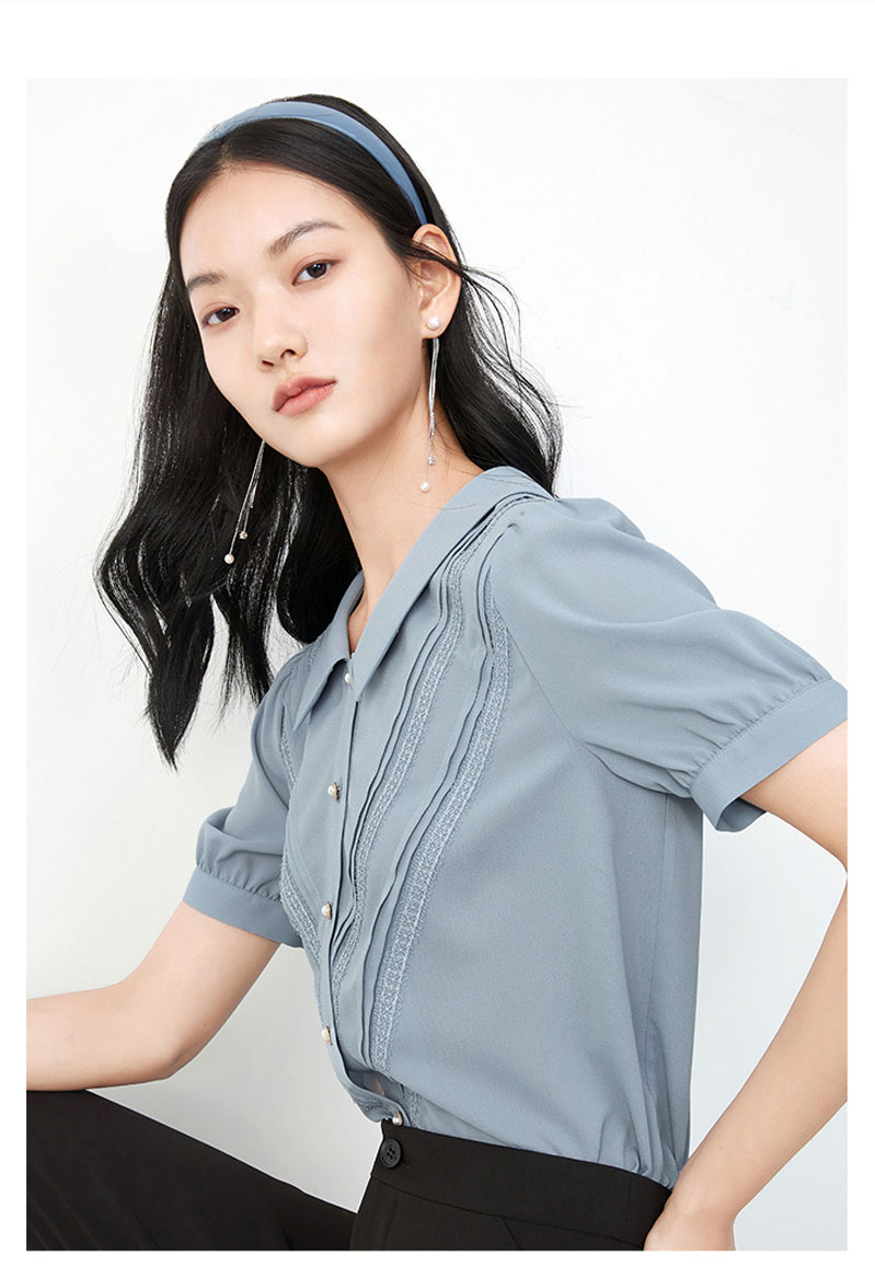 2023夏新款纯色方领百搭显瘦修身气质雪纺短袖折边衬衫 JTBX60206