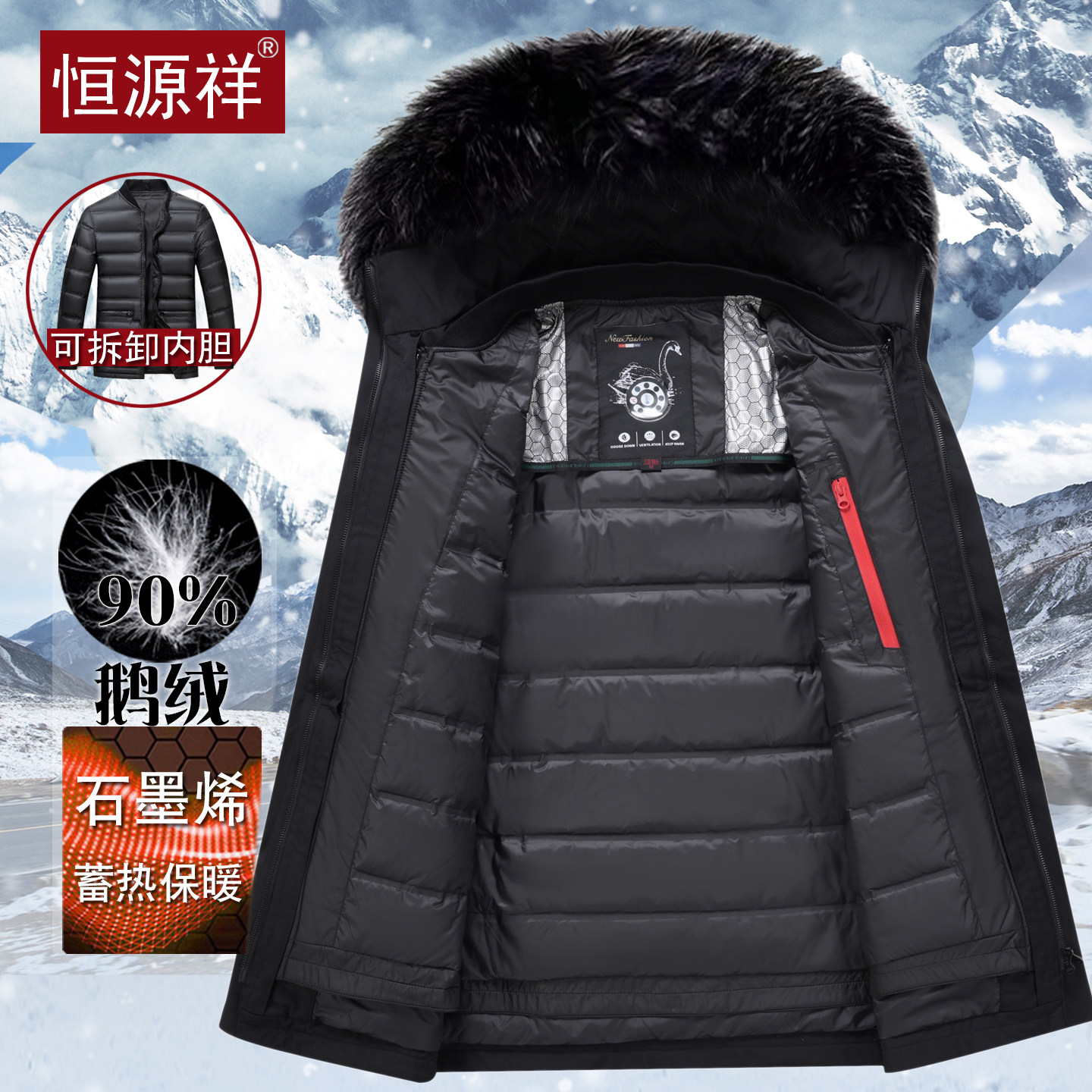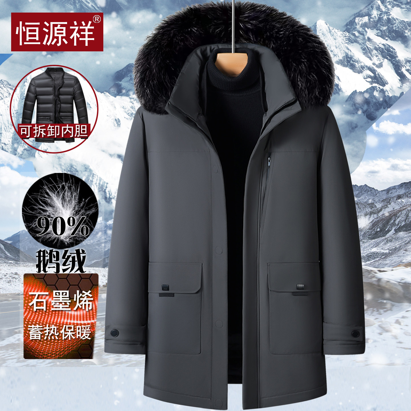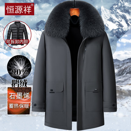 恒源祥中老年高档鹅绒羽绒服男士中长款可脱卸内胆爸爸装保暖外套