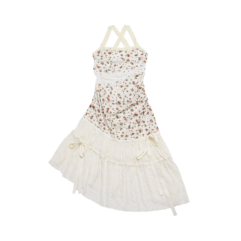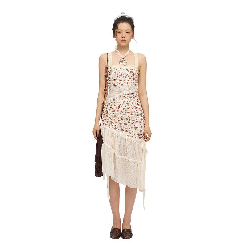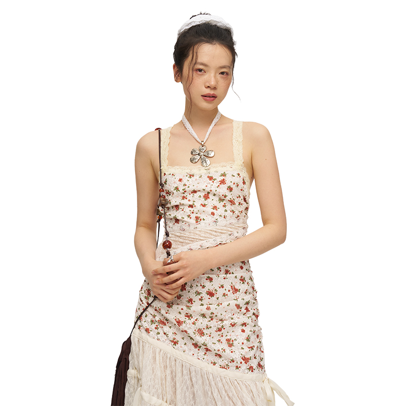 MOF礼物商店 米色印花蕾丝挂脖连衣裙无袖吊带连衣裙小碎花露背女