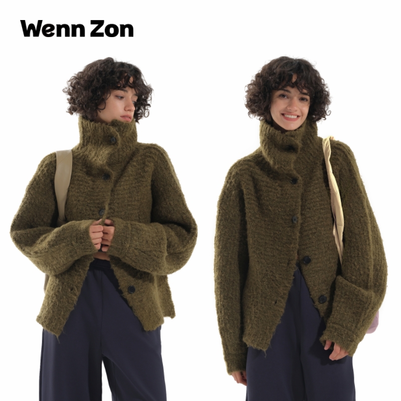 Wenn Zon海藻绿羊毛混纺高领针织外套女休闲宽松慵懒圈圈纱毛衣