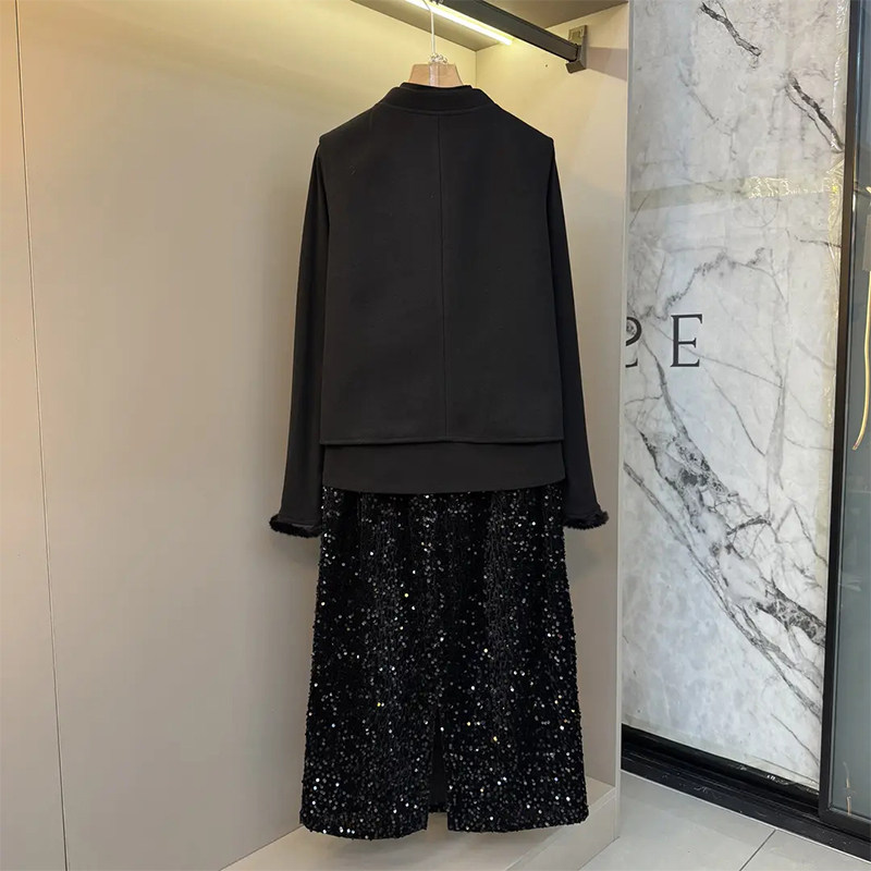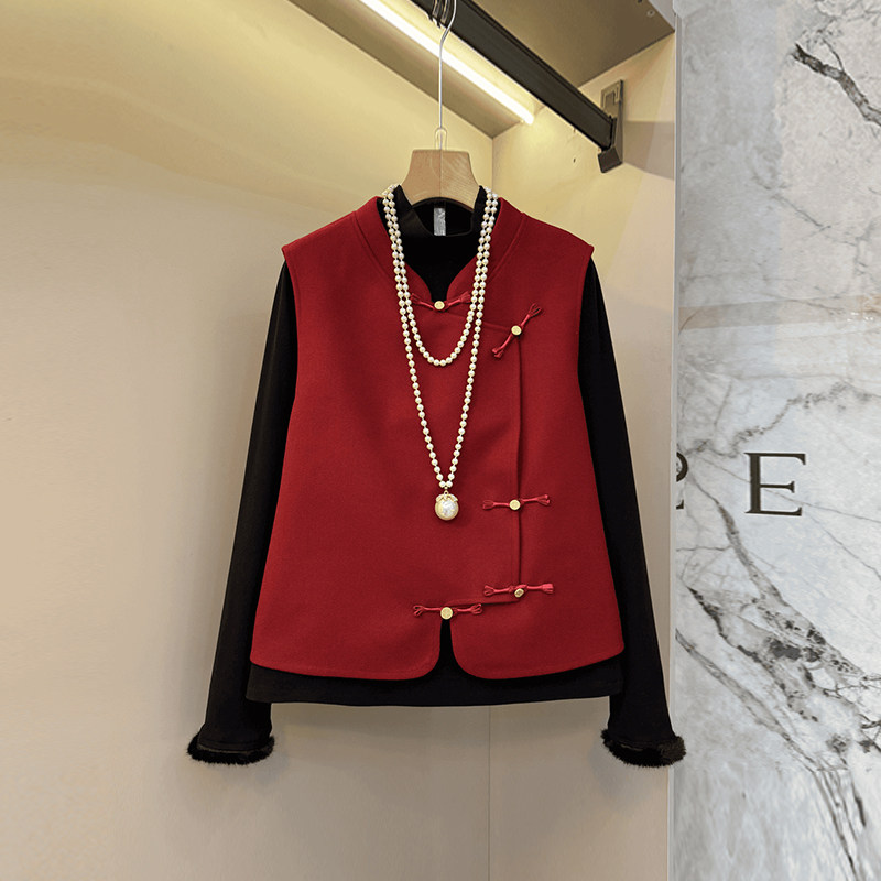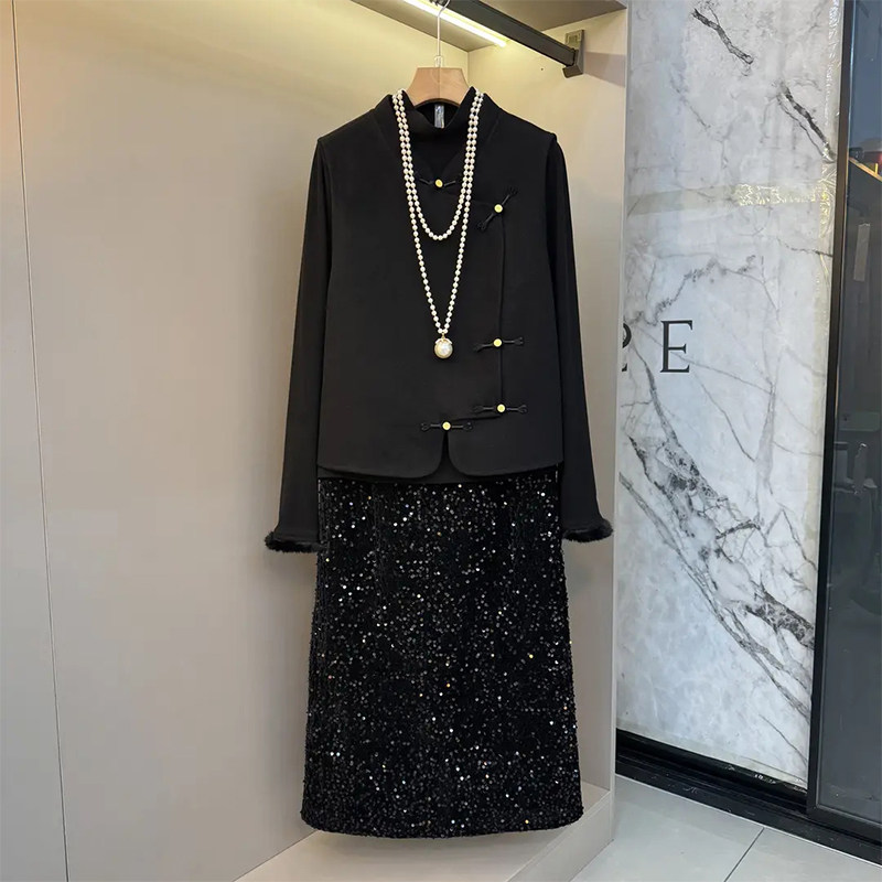 立领盘扣马甲毛毛袖口小衫半身裙