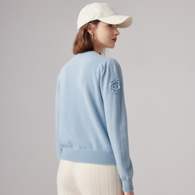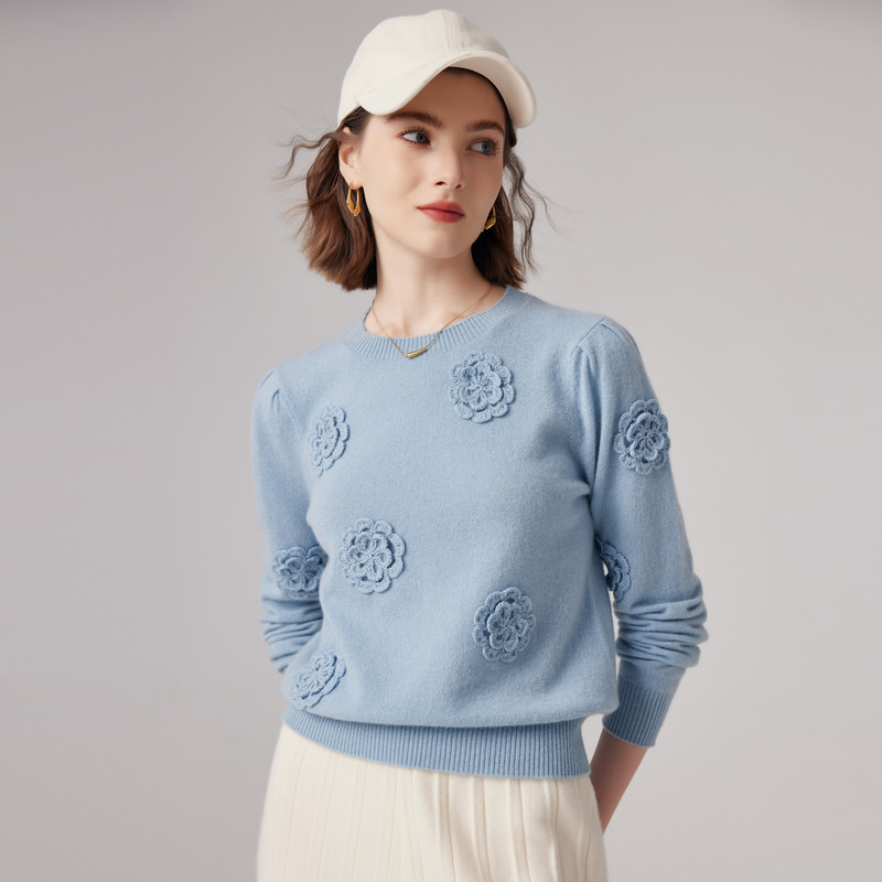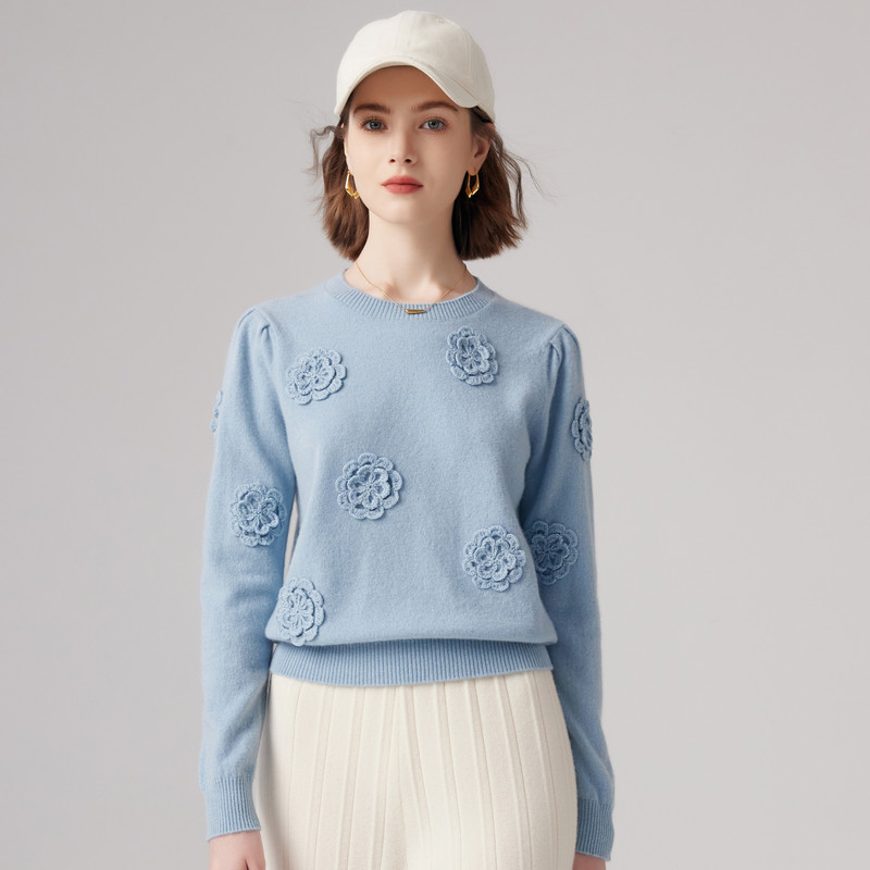 帕罗纯羊绒衫秋冬立体提花针织毛衣圆领套头纯色宽松长袖女上衣
