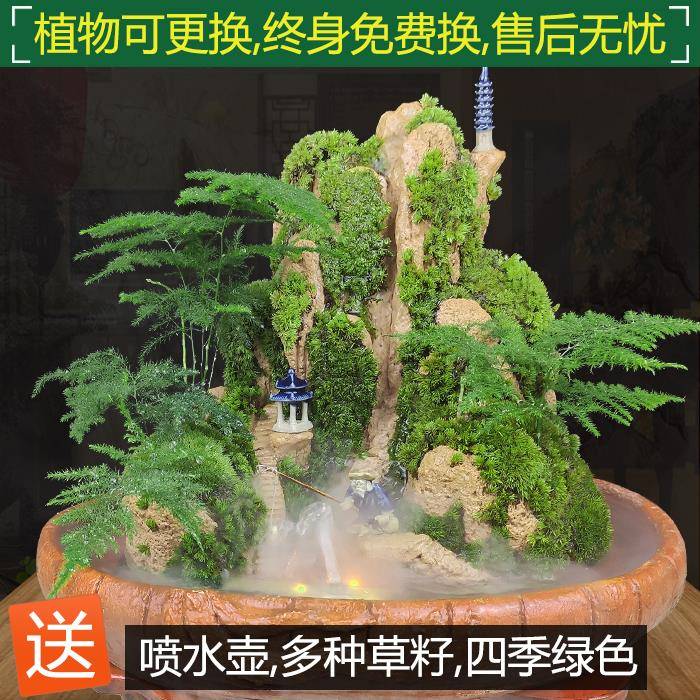 真花真草招财假山流水喷泉摆件造景植物小型鱼缸池客厅装饰品礼品